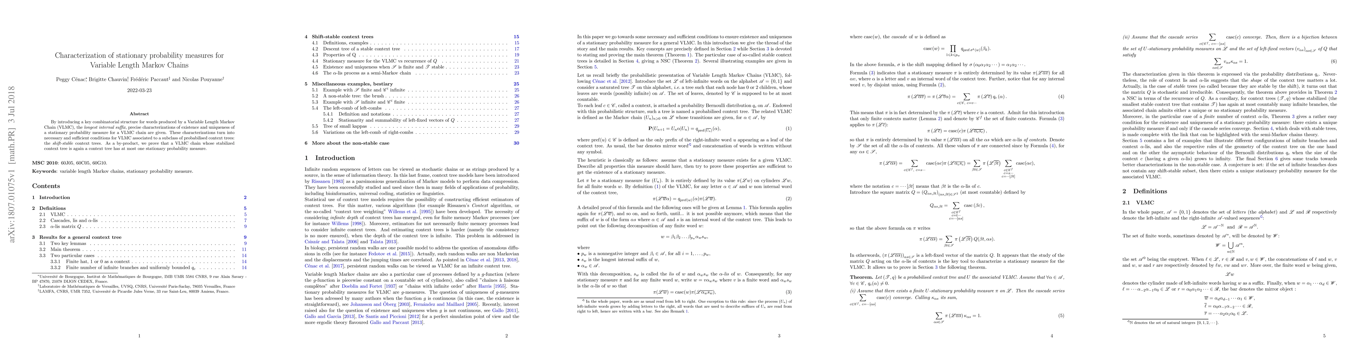By introducing a key combinatorial structure for words produced by a Variable Length Markov Chain (VLMC), the longest internal suffix, precise characterizations of existence and uniqueness of a stationary probability measure for a VLMC chain are given. These characterizations turn into necessary and sufficient conditions for VLMC associated to a subclass of probabilised context trees: the shift-stable context trees. As a by-product, we prove that a VLMC chain whose stabilized context tree is again a context tree has at most one stationary probability measure.