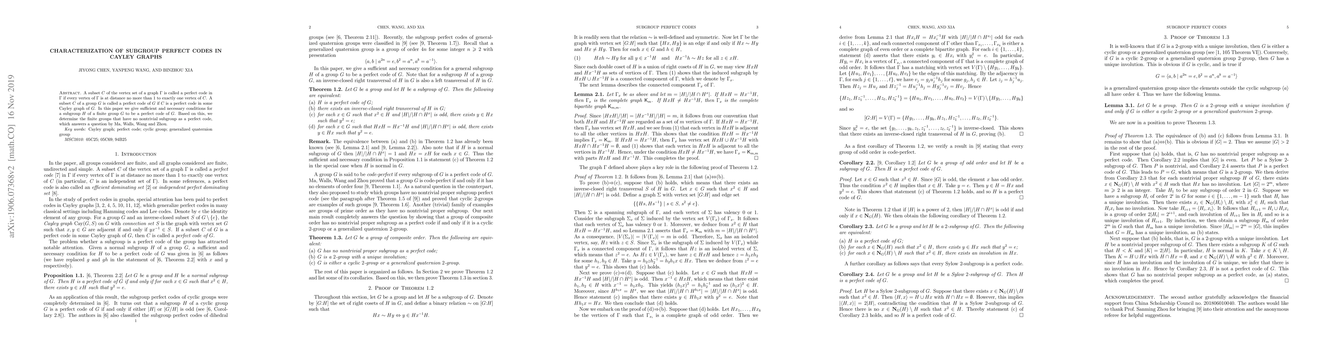Researchers studied perfect codes in Cayley graphs of finite groups, determining conditions for subgroups to be perfect codes and finding groups with no nontrivial subgroup as perfect codes.