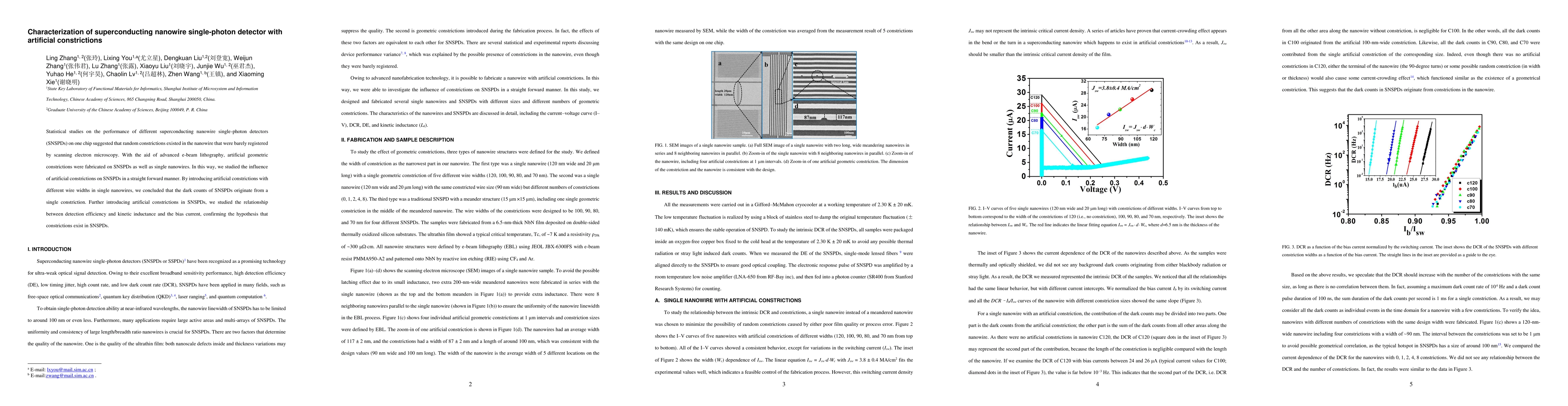 Researchers created artificial constrictions in superconducting nanowire single-photon detectors to study their effect on performance, confirming that dark counts originate from a single constriction. The study sheds light on the relationship between detection efficiency, kinetic inductance, and bias current in SNSPDs.