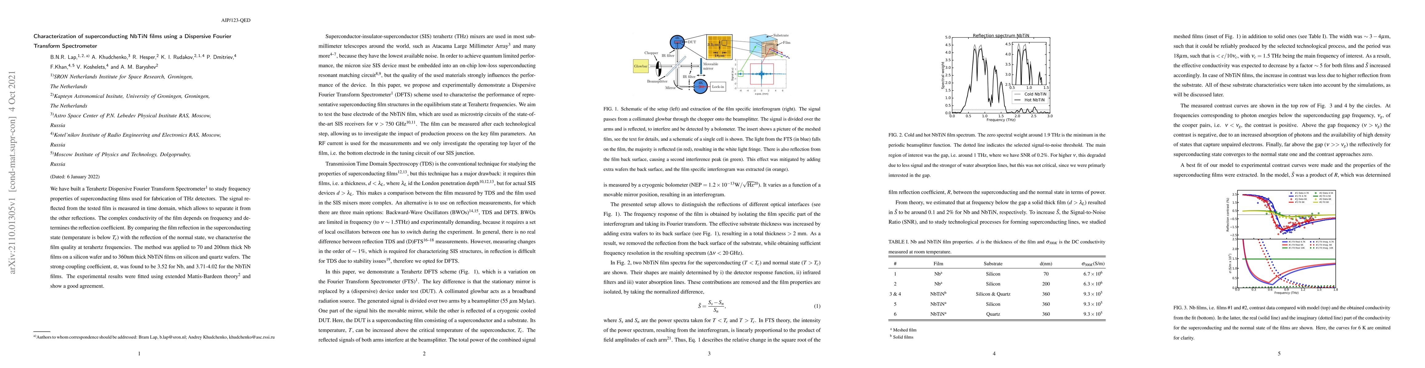 We have built a Terahertz Dispersive Fourier Transform Spectrometer \cite{Birch1987} to study frequency properties of superconducting films used for fabrication of THz detectors. The signal reflected from the tested film is measured in time domain, which allows to separate it from the other reflections. The complex conductivity of the film depends on frequency and determines the reflection coefficient. By comparing the film reflection in the superconducting state (temperature is below $T_c$) with the reflection of the normal state, we characterise the film quality at terahertz frequencies. The method was applied to 70 and 200nm thick Nb films on a silicon wafer and to 360nm thick NbTiN films on silicon and quartz wafers. The strong-coupling coefficient, $\alpha$, was found to be 3.52 for Nb, and 3.71-4.02 for the NbTiN films. The experimental results were fitted using extended Mattis-Bardeen theory \cite{Noguchi2012} and show a good agreement.