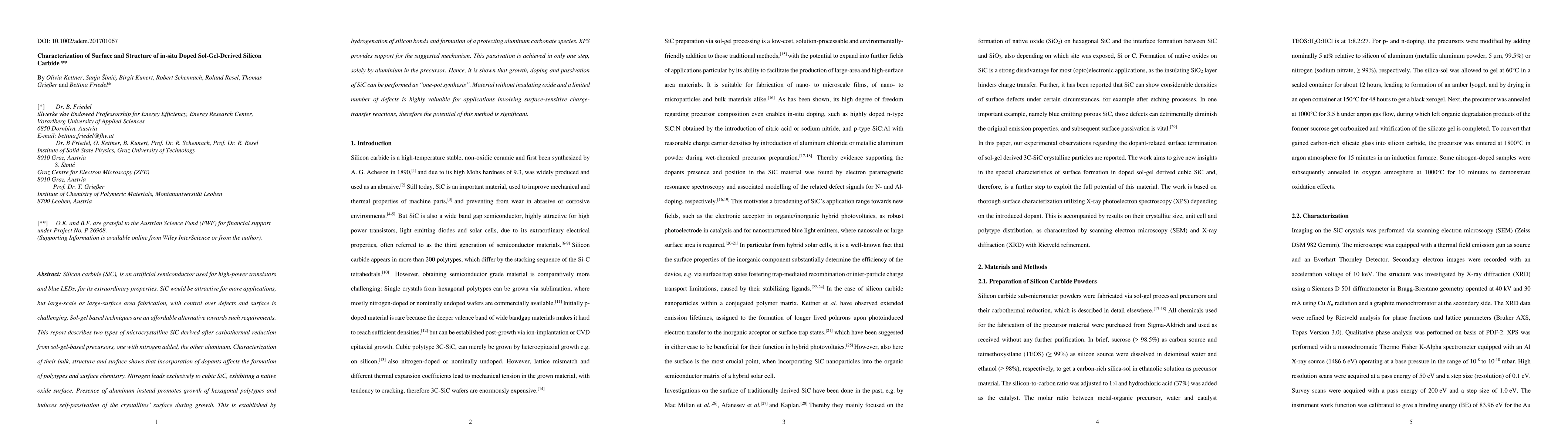 This study investigates sol-gel-derived silicon carbide (SiC) doped with nitrogen or aluminum, revealing that nitrogen promotes cubic SiC with a native oxide surface, while aluminum induces hexagonal polytypes and self-passivation via hydrogenated silicon bonds and aluminum carbonate formation. The one-pot synthesis method offers a defect-limited material valuable for surface-sensitive applications.