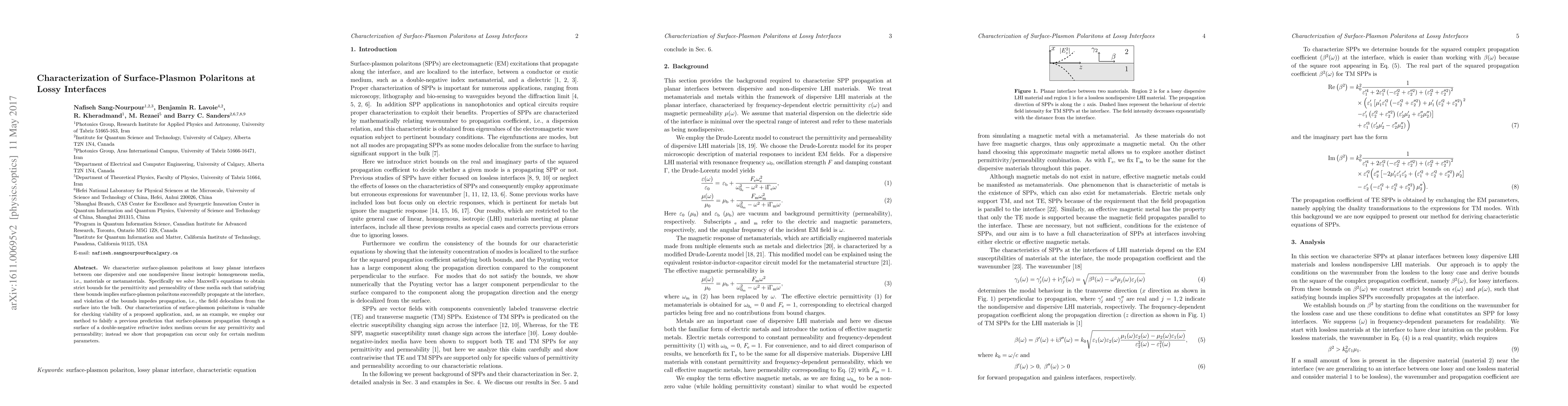 We characterize surface-plasmon polaritons at lossy planar interfaces between one dispersive and one nondispersive linear isotropic homogeneous media, i.e., materials or metamaterials. Specifically we solve Maxwell's equations to obtain strict bounds for the permittivity and permeability of these media such that satisfying these bounds implies surface-plasmon polaritons successfully propagate at the interface, and violation of the bounds impedes propagation, i.e., the field delocalizes from the surface into the bulk. Our characterization of surface-plasmon polaritons is valuable for checking viability of a proposed application, and, as an example, we employ our method to falsify a previous prediction that surface-plasmon propagation through a surface of a double-negative refractive index medium occurs for any permittivity and permeability; instead we show that propagation can occur only for certain medium parameters.