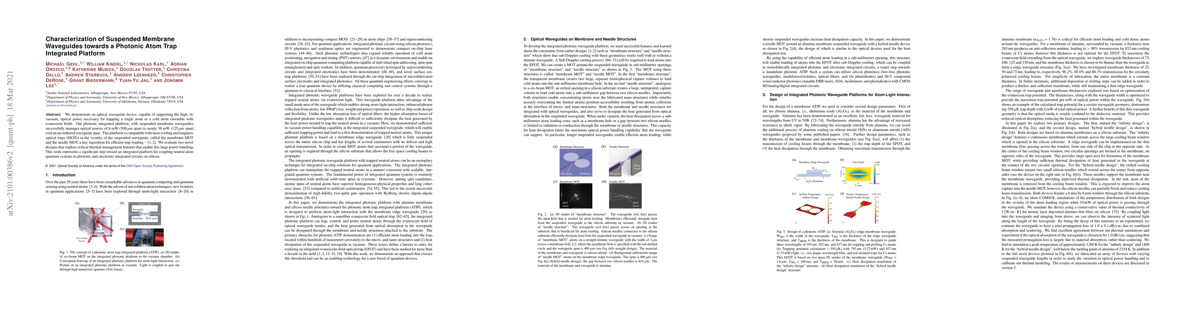 We demonstrate an optical waveguide device, capable of supporting the high, in-vacuum, optical power necessary for trapping a single atom or a cold atom ensemble with evanescent fields. Our photonic integrated platforms, with suspended membrane waveguides, successfully manages optical powers of 6 mW (500 um span) to nearly 30 mW (125 um span) over an un-tethered waveguide span. This platform is compatible with laser cooling and magneto-optical traps (MOTs) in the vicinity of the suspended waveguide, called the membrane MOT and the needle MOT, a key ingredient for efficient trap loading. We evaluate two novel designs that explore critical thermal management features that enable this large power handling. This work represents a significant step toward an integrated platform for coupling neutral atom quantum systems to photonic and electronic integrated circuits on silicon.