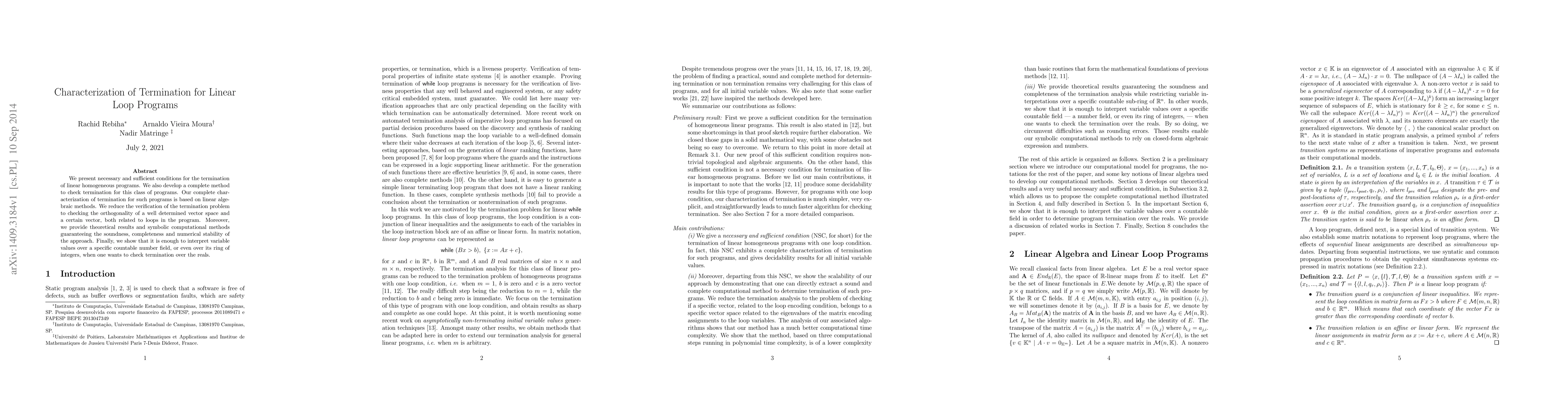 This paper characterizes necessary and sufficient conditions for the termination of linear homogeneous programs using linear algebraic methods. It presents a complete method to check termination based on verifying the orthogonality of specific vector spaces and vectors, ensuring soundness, completeness, and numerical stability.