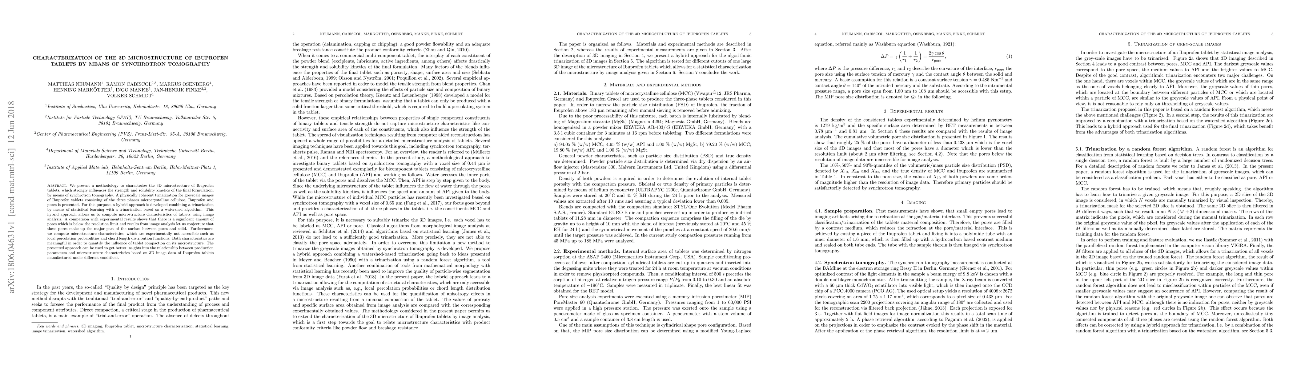 This research introduces a method using synchrotron tomography to analyze the 3D microstructure of Ibuprofen tablets, identifying key phases like microcrystalline cellulose, Ibuprofen, and pores. A hybrid trinarization approach combining statistical learning and watershed algorithms enables computation of microstructure characteristics, revealing previously inaccessible details like local percolation probabilities and chord length distribution functions, aiding understanding of the impact of production parameters on tablet microstructure.