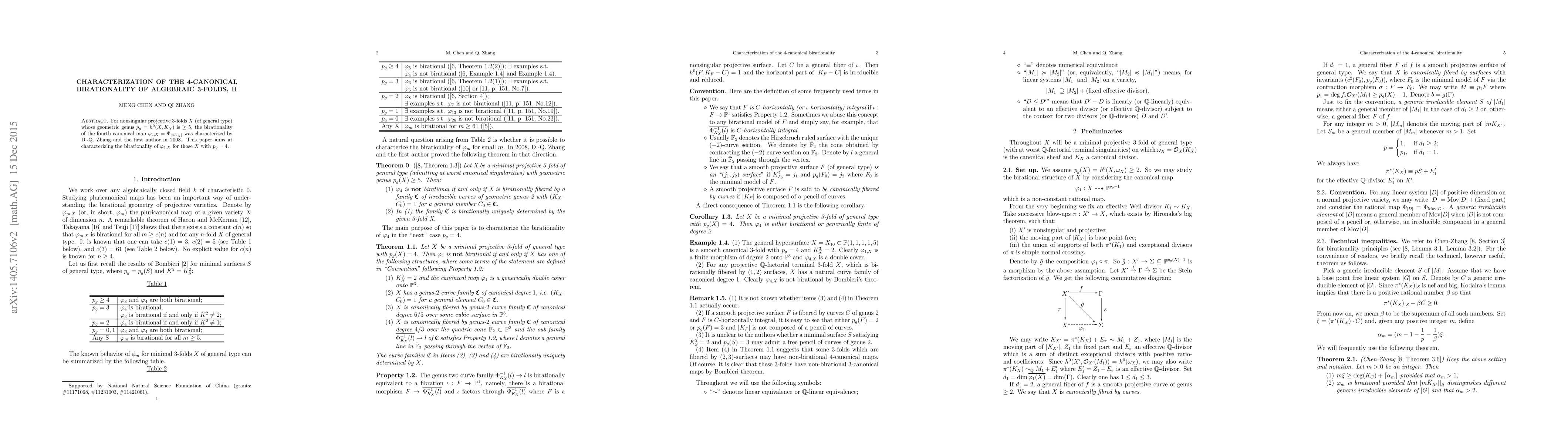 For nonsingular projective 3-folds $X$ (of general type) whose geometric genus $p_g=h^0(X, K_X)$ is $\geq 5$, the birationality of the fourth canonical map $\varphi_{4,X}=\Phi_{|4K_X|}$ was characterized by D.-Q. Zhang and the first author in 2008. This paper aims at characterizing the birationality of $\varphi_{4,X}$ for those $X$ with $p_g=4$.