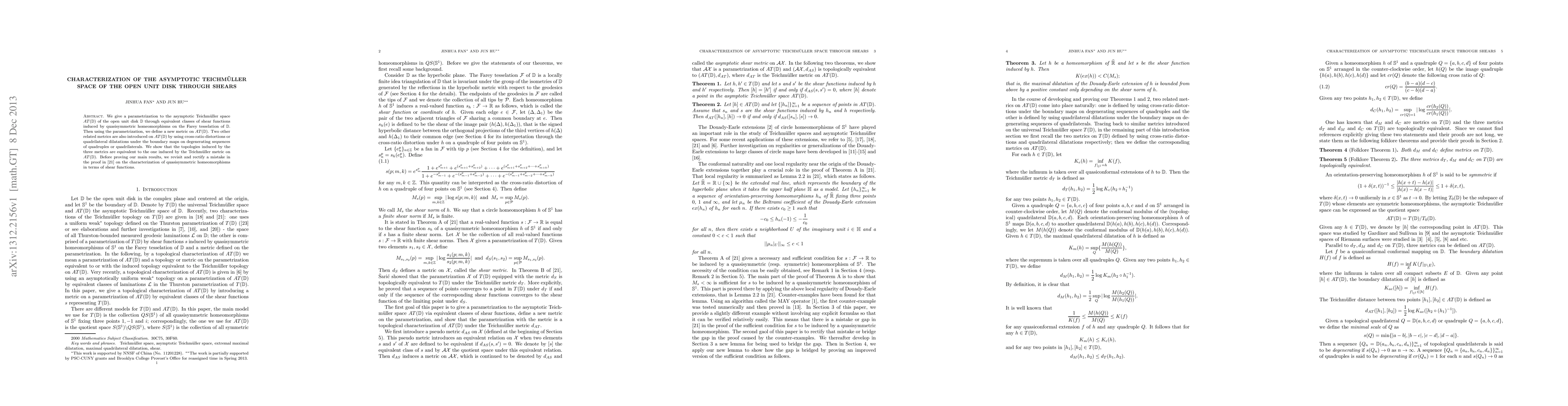 We give a parametrization to the asymptotic Teichmuller space of the open unit disk through equivalent classes of shear functions induced by quasisymmetric homeomorphisms on the Farey tesselation of the unit disk. Then using the parametrization, we define a new metric on the asymptotic Teichmuller space. Two other related metrics are also introduced on the asymptotic Teichmuller space by using cross-ratio distortions or quadrilateral dilatations under the boundary maps on degenerating sequences of quadruples or quadrilaterals. We show that the topologies induced by the three metrics are equivalent to the one induced by the Teichmuller metric on the asymptotic Teichmuller space. Before proving our main results, we revisit and rectify a mistake in the proof in the reference [21] on the characterization of quasisymmetric homeomorphisms in terms of shear functions.