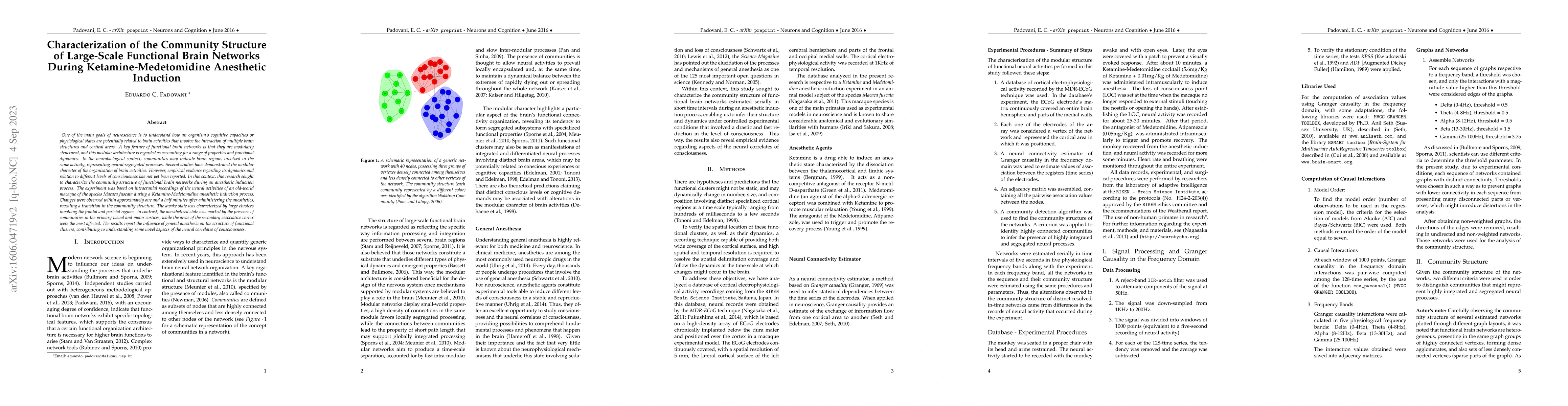 This study characterizes the community structure of functional brain networks in a Macaca fuscata during Ketamine-Medetomidine anesthesia induction, revealing shifts from large frontal and parietal clusters in the awake state to communities in primary visual and motor cortices in the anesthetized state, highlighting the neural correlates of consciousness.