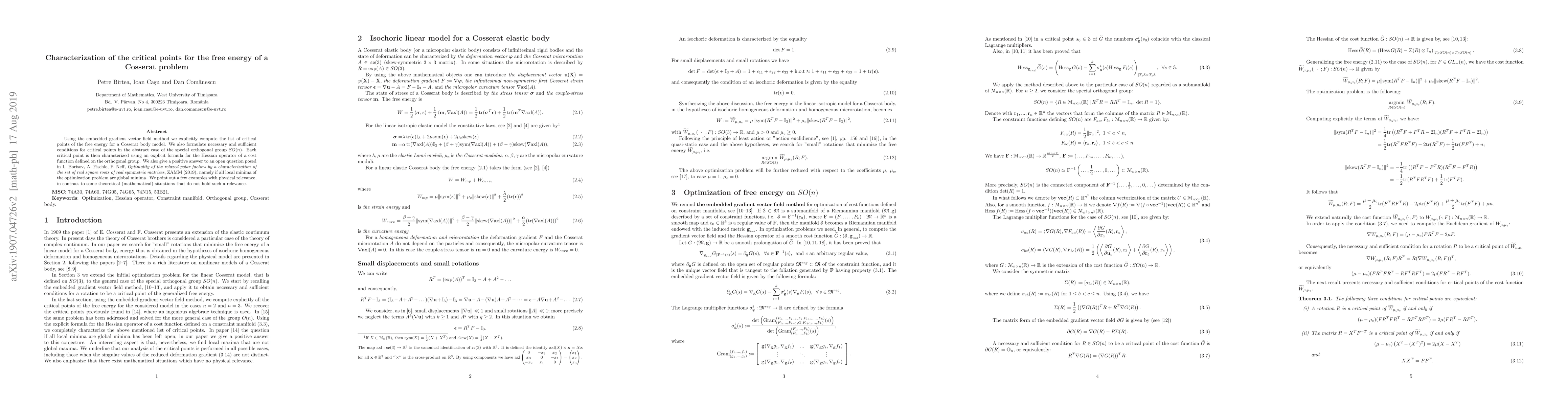 Using the embedded gradient vector field method we explicitly compute the list of critical points of the free energy for a Cosserat body model. We also formulate necessary and sufficient conditions for critical points in the abstract case of the special orthogonal group SO(n). Each critical point is then characterized using an explicit formula for the Hessian operator of a cost function defined on the orthogonal group. We also give a positive answer to an open question posed in L. Borisov, A. Fischle, P. Neff, "Optimality of the relaxed polar factors by a characterization of the set of real square roots of real symmetric matrices", ZAMM (2019), namely if all local minima of the optimization problem are global minima. We point out a few examples with physical relevance, in contrast to some theoretical (mathematical) situations that do not hold such a relevance.