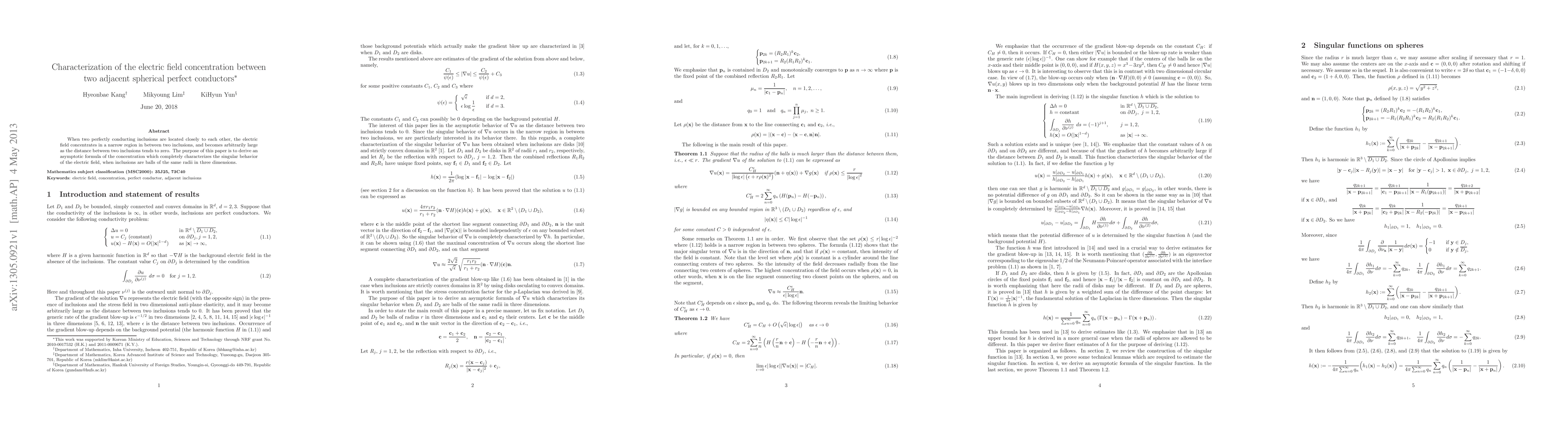 The paper presents a detailed asymptotic analysis of the electric field concentration between two adjacent spherical perfect conductors, providing a comprehensive formula for the singular behavior.