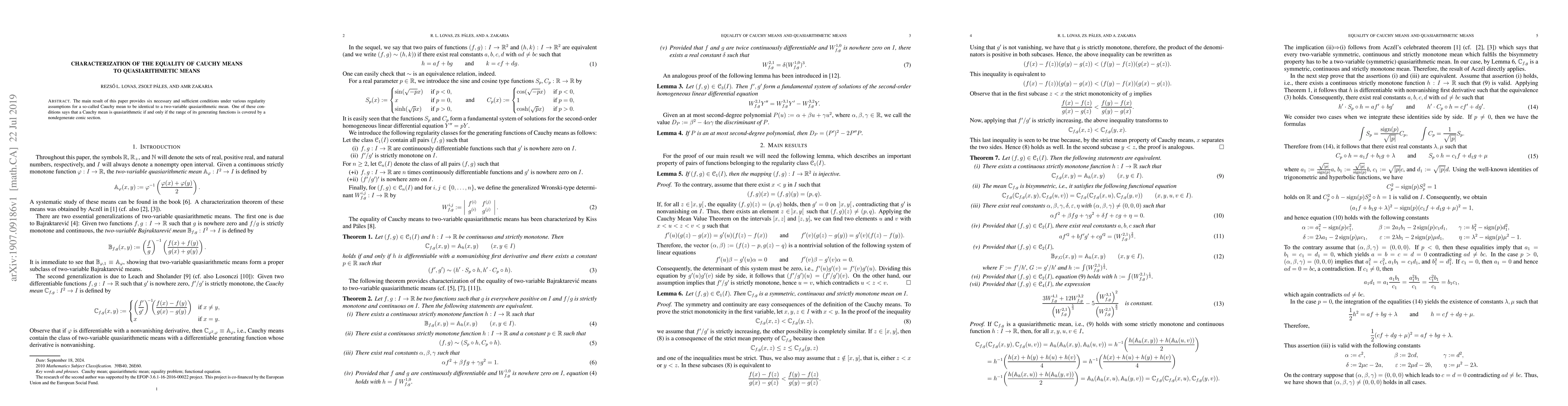 This work extends previous research by providing a comprehensive characterization of the equality of Cauchy means to quasiarithmetic means, incorporating both algebraic and geometric perspectives.