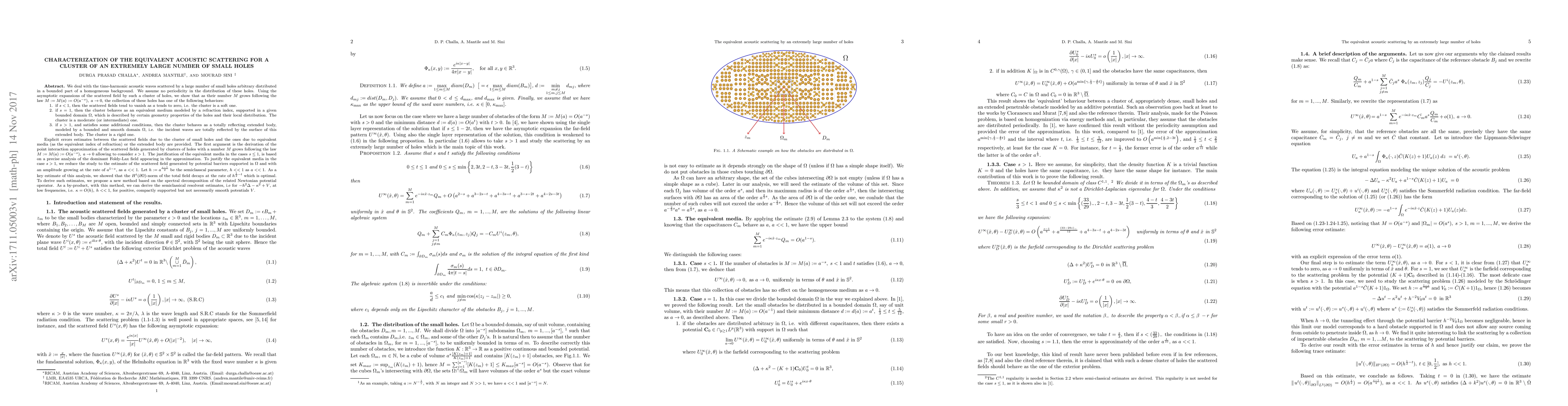 We deal with the time-harmonic acoustic waves scattered by a large number of small holes, of maximal radius $a, a<<1$, arbitrary (i.e. not necessarily periodically) distributed in a bounded part of a homogeneous background. We show that as their number $M$ grows following the law $M:=M(a):=O(a^{-s}), \; a<<1$, the collection of these holes has one of the following behaviors: 1. if $s<1$, then the scattered fields tend to vanish as $a$ tends to zero, i.e. the cluster is a soft one. 2. if $s=1$, then the cluster behaves as an equivalent medium modeled by a refraction index, supported in a given bounded domain $\Omega$, which is described by certain geometry properties of the holes and their local distribution. The cluster is a moderate (or intermediate) one. 3. if $s>1$, then the cluster behaves as a totally reflecting extended body, modeled by a bounded and smooth domain $\Omega$, i.e. the incident waves are totally reflected by the surface of this extended body. The cluster is a rigid one. These approximations are provided with explicit error estimates in terms of $a,\; a<<1$.