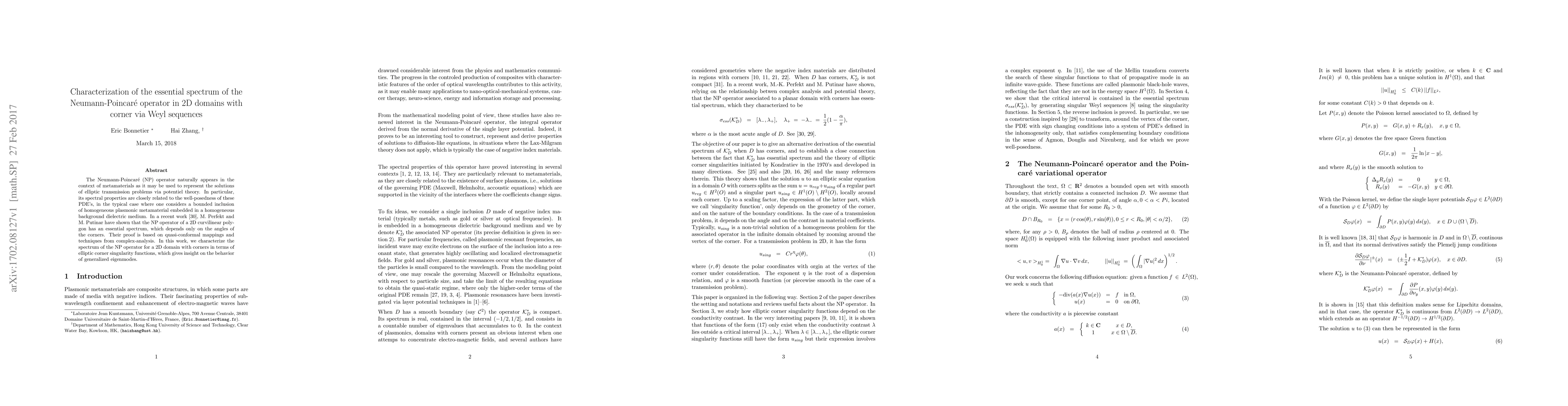 The Neumann-Poincar\'e (NP) operator naturally appears in the context of metamaterials as it may be used to represent the solutions of elliptic transmission problems via potentiel theory. In particular, its spectral properties are closely related to the well-posedness of these PDE's, in the typical case where one considers a bounded inclusion of homogeneous plasmonic metamaterial embedded in a homogeneous background dielectric medium. In a recent work, M. Perfekt and M. Putinar have shown that the NP operator of a 2D curvilinear polygon has an essential spectrum, which depends only on the angles of the corners. Their proof is based on quasi-conformal mappings and techniques from complex-analysis. In this work, we characterize the spectrum of the NP operator for a 2D domain with corners in terms of elliptic corner singularity functions, which gives insight on the behavior of generalized eigenmodes.