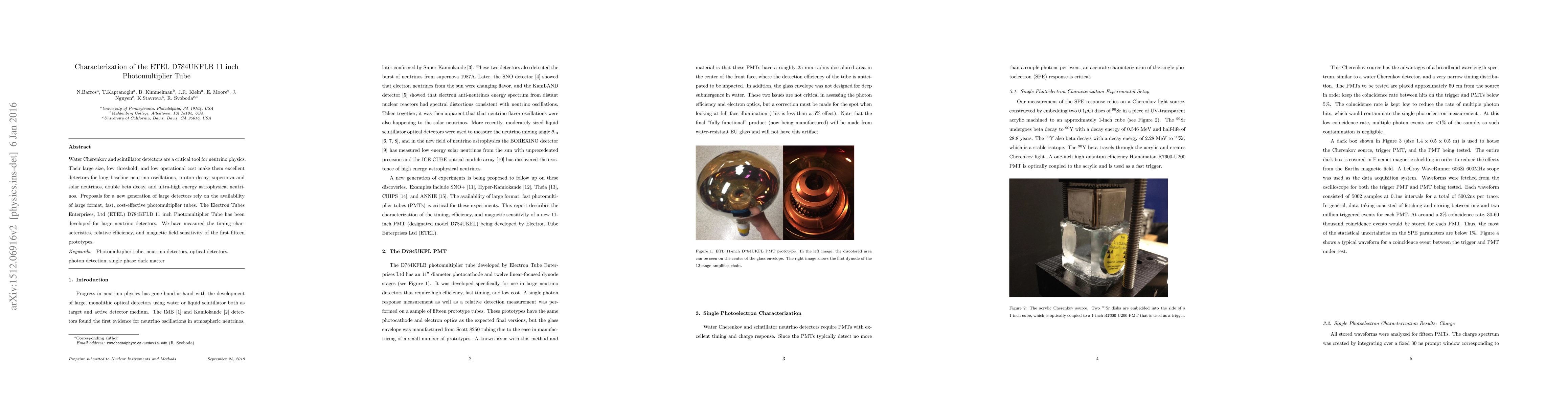 Water Cherenkov and scintillator detectors are a critical tool for neutrino physics.Their large size, low threshold, and low operational cost make them excellent detectors for long baseline neutrino oscillations, proton decay, supernova and solar neutrinos, double beta decay, and ultra-high energy astrophysical neutrinos. Proposals for a new generation of large detectors rely on the availability of large format, fast, cost-effective photomultiplier tubes. The Electron Tubes Enterprises, Ltd (ETEL) D784KFLB 11 inch Photomultiplier Tube has been developed for large neutrino detectors. We have measured the timing characteristics, relative efficiency, and magnetic field sensitivity of the first fifteen prototypes.