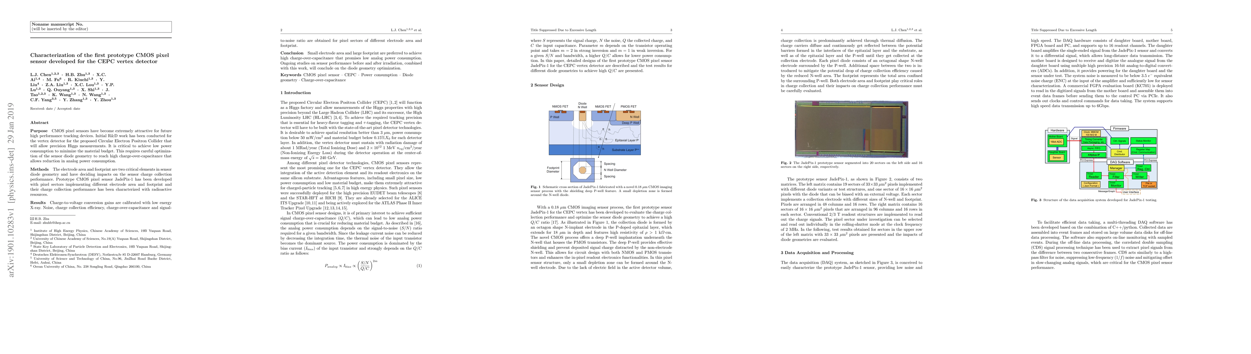 This paper characterizes the first prototype CMOS pixel sensor, JadePix-1, developed for the CEPC vertex detector, focusing on optimizing sensor diode geometry for low power consumption. The study finds that small electrode areas and large footprints yield high charge-over-capacitance, promising reduced analog power consumption.