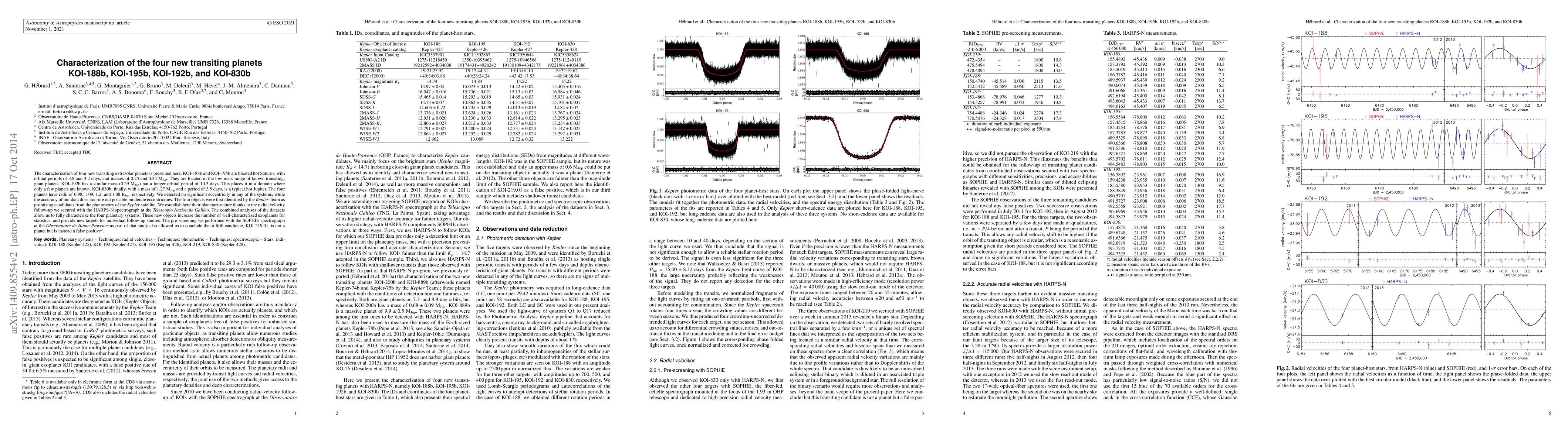 This paper characterizes four new transiting exoplanets: KOI-188b, KOI-195b, KOI-192b, and KOI-830b, identified via Kepler satellite data and confirmed through radial velocity measurements using the HARPS-N spectrograph. These planets range from bloated hot Saturns to typical hot Jupiters, expanding the catalog of well-studied exoplanets.