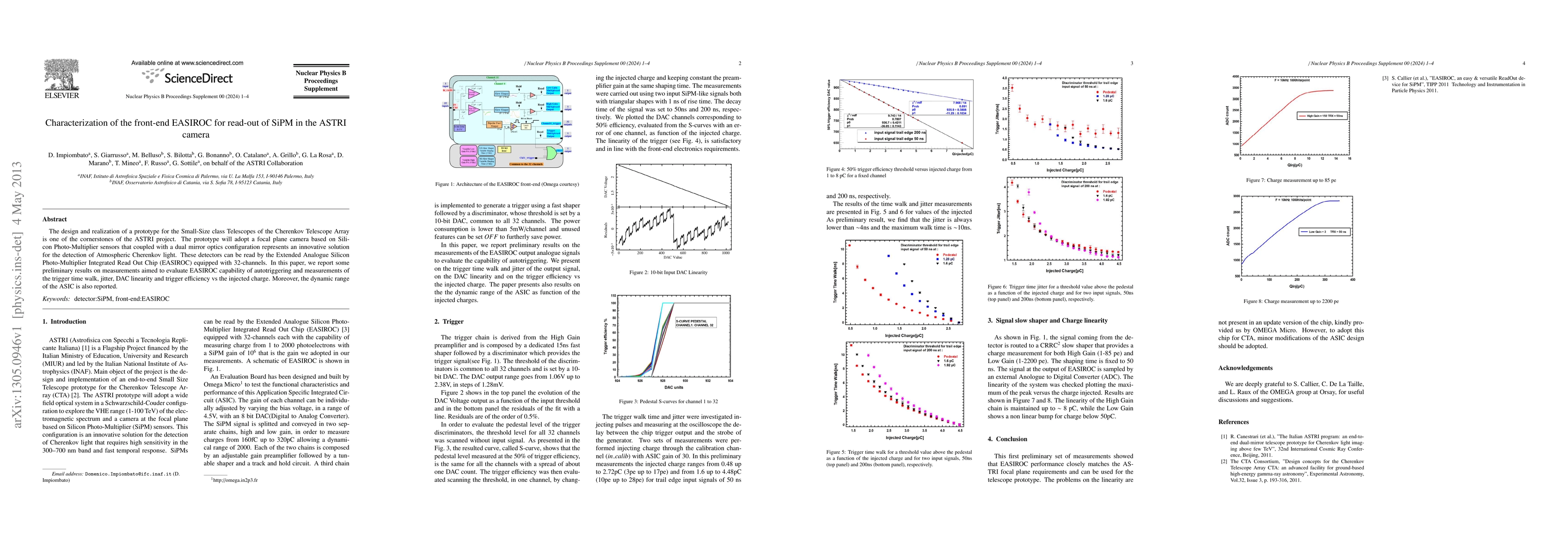 This paper presents preliminary results on the characterization of the EASIROC front-end read-out chip for Silicon Photo-Multipliers in the ASTRI camera, focusing on autotriggering capabilities, trigger time walk, jitter, DAC linearity, and trigger efficiency against injected charge, along with the dynamic range of the ASIC.