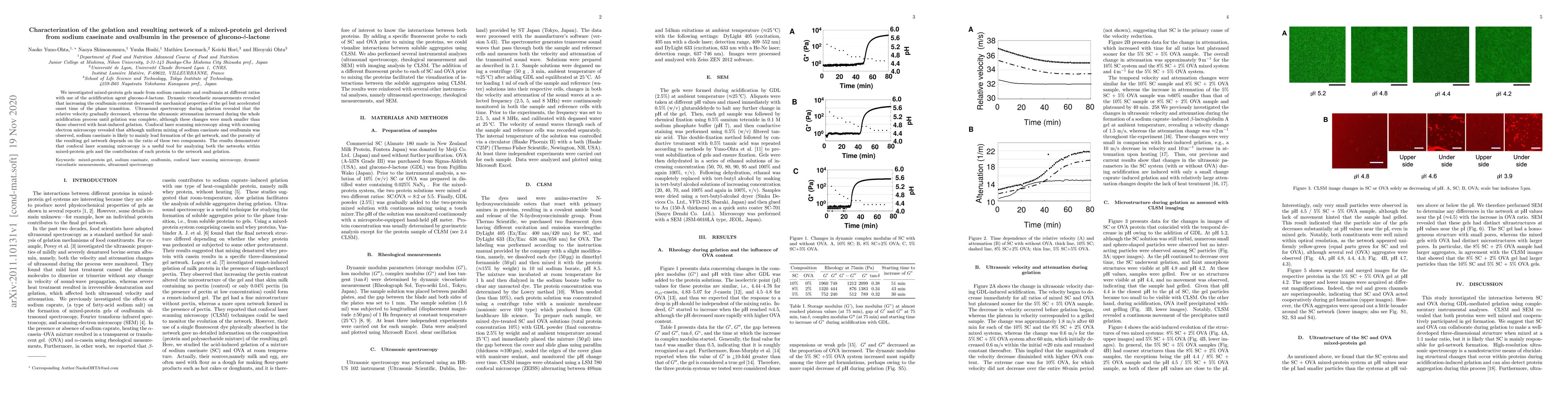 We investigated mixed-protein gels made from sodium caseinate and ovalbumin at different ratios with use of the acidification agent glucono-$\delta$-lactone. Dynamic viscoelastic measurements revealed that increasing the ovalbumin content decreased the mechanical properties of the gel but accelerated onset time of the phase transition. Ultrasound spectroscopy during gelation revealed that the relative velocity gradually decreased, whereas the ultrasonic attenuation increased during the whole acidification process until gelation was complete, although these changes were much smaller than those observed with heat-induced gelation. Confocal laser scanning microscopy along with scanning electron microscopy revealed that although uniform mixing of sodium caseinate and ovalbumin was observed, sodium caseinate is likely to mainly lead formation of the gel network, and the porosity of the resulting gel network depends on the ratio of these two components. The results demonstrate that confocal laser scanning microscopy is a useful tool for analyzing both the networks within mixed-protein gels and the contribution of each protein to the network and gelation.