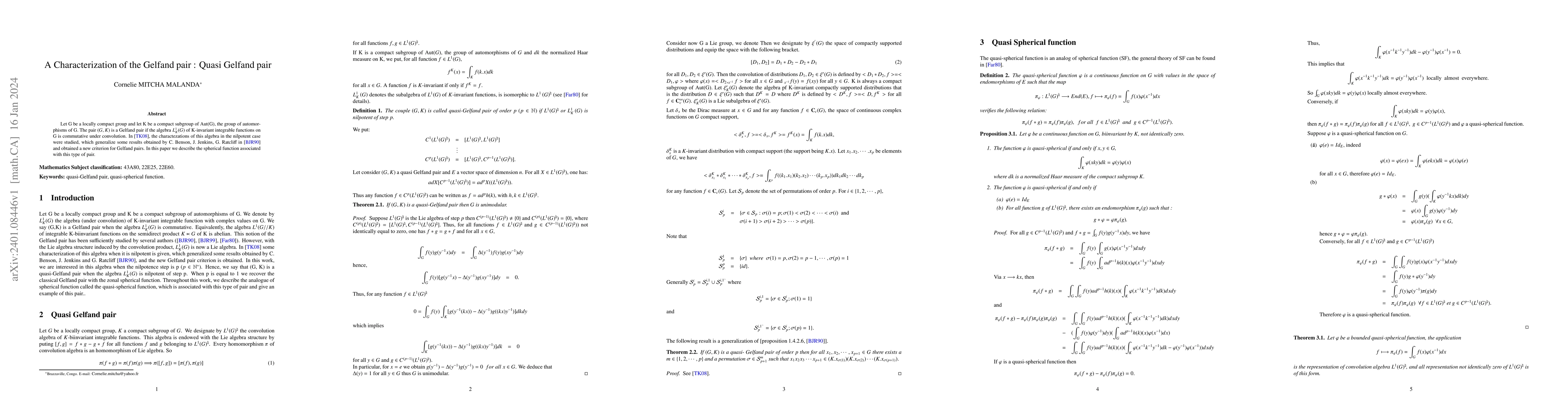 This paper investigates the Gelfand pair $(G, K)$, where $G$ is a locally compact group and $K$ is a compact subgroup of the automorphisms of $G$. It characterizes the spherical function associated with quasi Gelfand pairs, extending previous results on nilpotent cases and providing new criteria for Gelfand pairs.