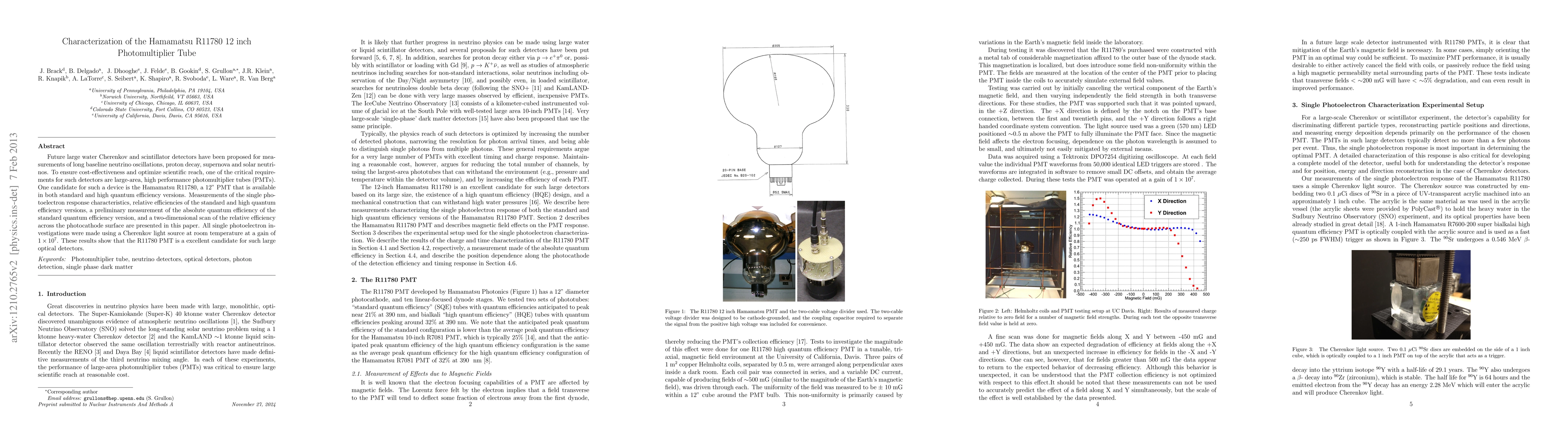 This paper characterizes the Hamamatsu R11780 12 inch PMT, a promising candidate for large-scale neutrino detectors. Results show excellent performance with high peak-to-valley ratios, narrow transit time spreads, and low late-pulsing probabilities, all measured at a gain of 1*10^7 using a Cherenkov light source at room temperature.