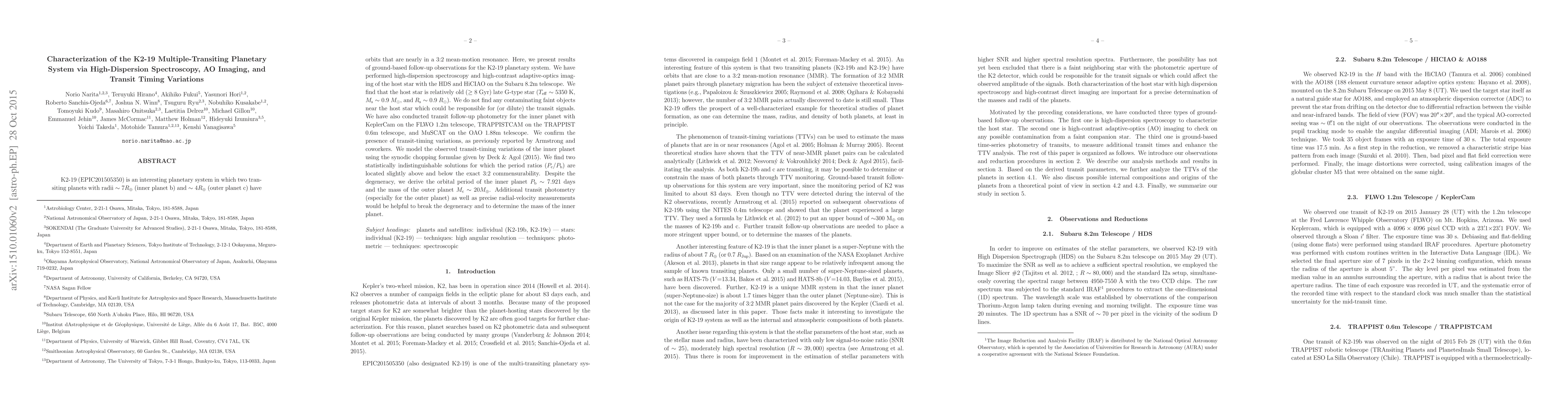This paper characterizes the K2-19 planetary system using high-dispersion spectroscopy, adaptive-optics imaging, and transit timing variations. The host star is identified as an old late G-type star, and no contaminating objects are found. Transit-timing variations confirm the 3:2 resonance between the two transiting planets, with the inner planet having a period of ~7.921 days and the outer planet a mass of ~20 Earth masses. Further observations are needed to resolve the degeneracy and determine the inner planet's mass.