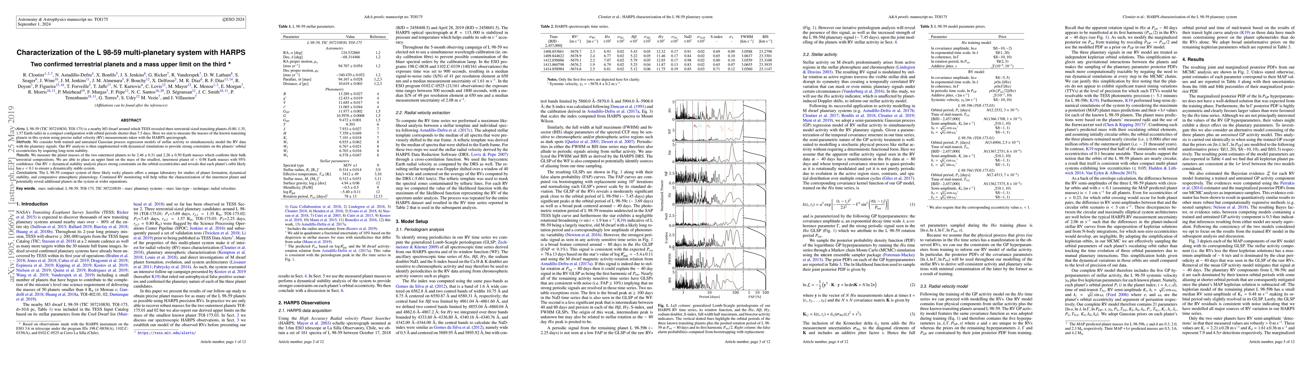This study characterizes the L 98-59 multi-planetary system using HARPS radial velocity measurements, confirming the terrestrial nature of two planets and setting an upper mass limit for the third. The analysis reveals low orbital eccentricities, suggesting a dynamically stable configuration.