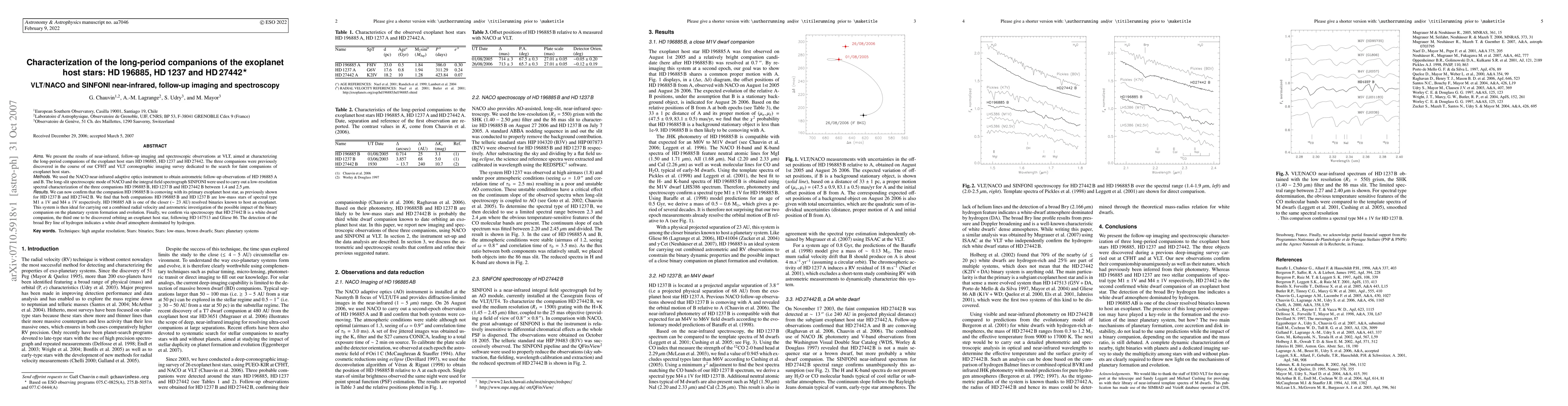 We present the results of near-infrared, follow-up imaging and spectroscopic observations at VLT, aimed at characterizing the long-period companions of the exoplanet host stars HD196885, HD1237 and HD27442. The three companions were previously discovered in the course of our CFHT and VLT coronographic imaging survey dedicated to the search for faint companions of exoplanet host stars. We used the NACO near-infrared adaptive optics instrument to obtain astrometric follow-up observations of HD196885 A and B. The long-slit spectroscopic mode of NACO and the integral field spectrograph SINFONI were used to carry out a low-resolution spectral characterization of the three companions HD196885 B, HD1237 B and HD27442 B between 1.4 and 2.5 microns. We can now confirm that the companion HD196885 B is comoving with its primary exoplanet host star, as previously shown for HD1237 B and HD27442 B. We find that both companions HD196885 B and HD1237 B are low-mass stars of spectral type M1V and M4V respectively. HD196885 AB is one of the closer (~23 AU) resolved binaries known to host an exoplanet. This system is then ideal for carrying out a combined radial velocity and astrometric investigation of the possible impact of the binary companion on the planetary system formation and evolution. Finally, we confirm via spectroscopy that HD27442 B is a white dwarf companion, the third one to be discovered orbiting an exoplanet host star, following HD147513 and Gliese 86. The detection of the broad Bracket gamma line of hydrogen indicates a white dwarf atmosphere dominated by hydrogen.