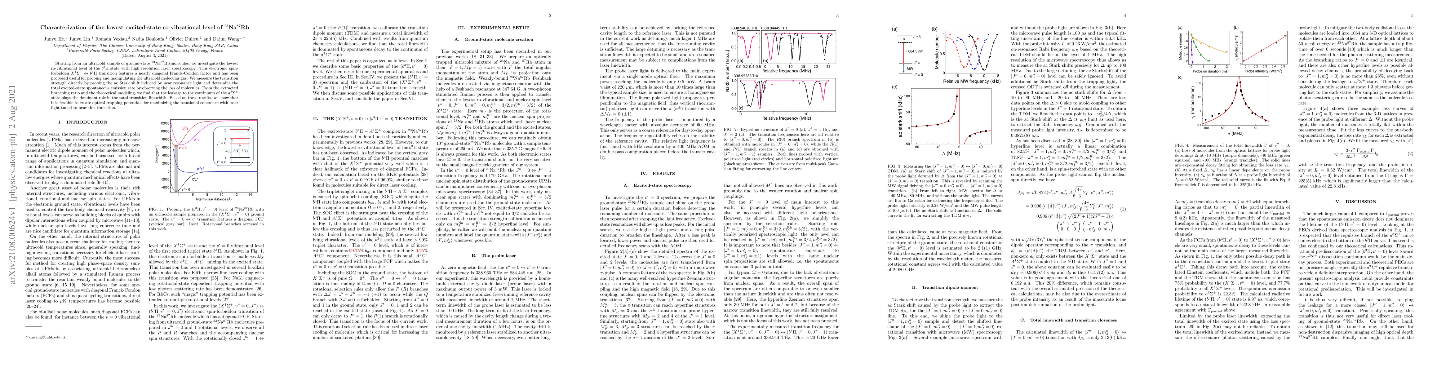 Starting from an ultracold sample of ground-state $^{23}$Na$^{87}$Rb molecules, we investigate the lowest ro-vibrational level of the $b^3\Pi$ state with high resolution laser spectroscopy. This electronic spin-forbidden $X^1\Sigma^+ \leftrightarrow b^3\Pi$ transition features a nearly diagonal Franck-Condon factor and has been proposed useful for probing and manipulating the ultracold molecular gas. We measure the transition strength directly by probing the ac Stark shift induced by near resonance light and determine the total excited-state spontaneous emission rate by observing the loss of molecules. From the extracted branching ratio and the theoretical modeling, we find that the leakage to the continuum of the $a^3\Sigma^+$ state plays the dominant role in the total transition linewidth. Based on these results, we show that it is feasible to create optical trapping potentials for maximizing the rotational coherence with laser light tuned to near this transition.