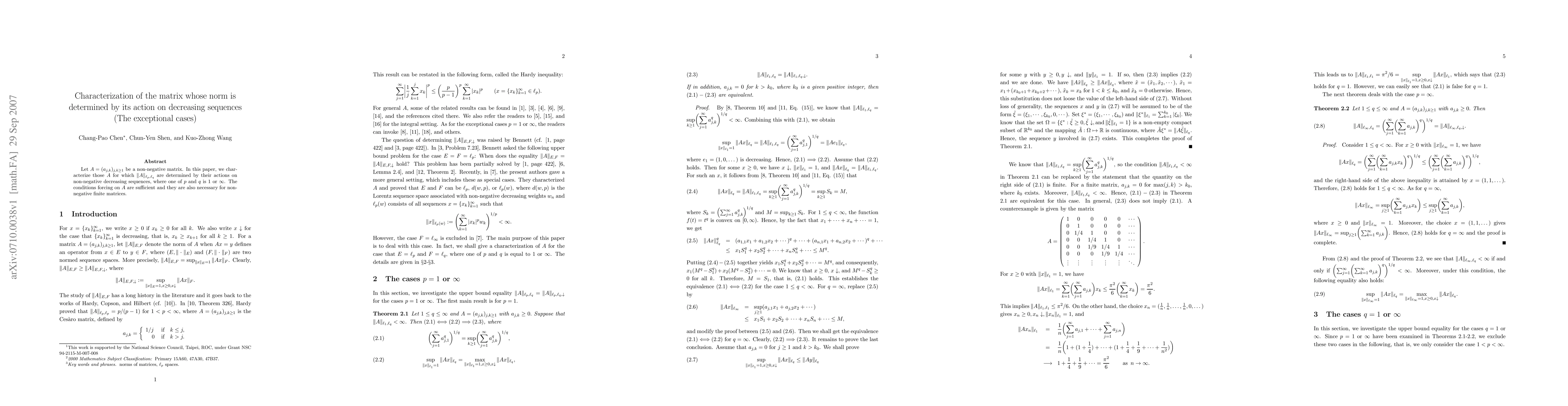 A research paper characterizes non-negative matrices whose matrix norm is determined by their action on decreasing sequences, focusing on necessary conditions for finite matrices.