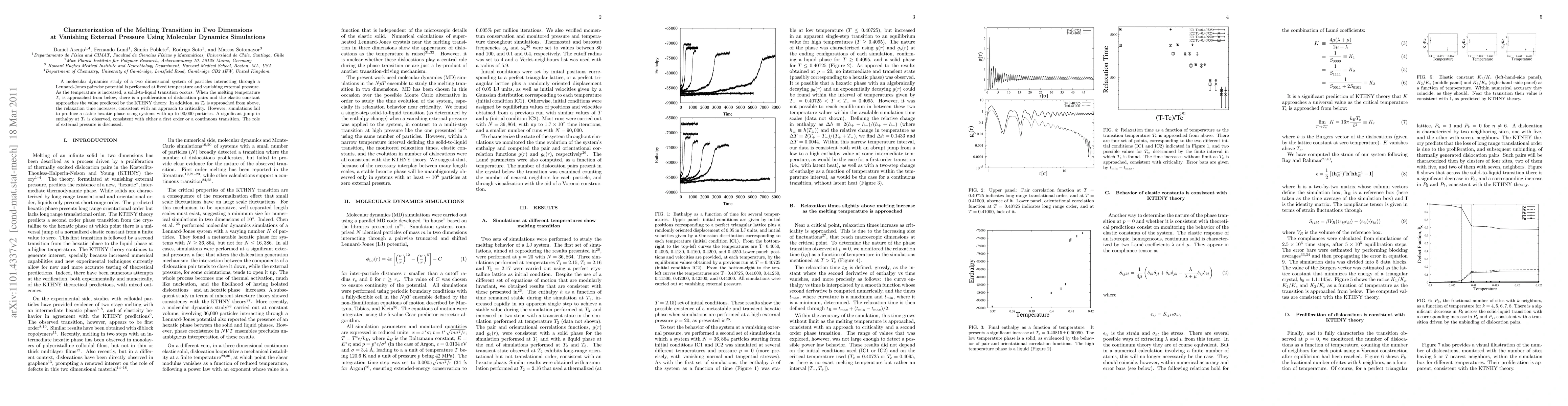 A molecular dynamics study of a two dimensional system of particles interacting through a Lennard-Jones pairwise potential is performed at fixed temperature and vanishing external pressure. As the temperature is increased, a solid-to-liquid transition occurs. When the melting temperature $T_c$ is approached from below, there is a proliferation of dislocation pairs and the elastic constant approaches the value predicted by the KTHNY theory. In addition, as $T_c$ is approached from above, the relaxation time increases, consistent with an approach to criticality. However, simulations fail to produce a stable hexatic phase using systems with up to 90,000 particles. A significant jump in enthalpy at $T_c$ is observed, consistent with either a first order or a continuous transition. The role of external pressure is discussed.