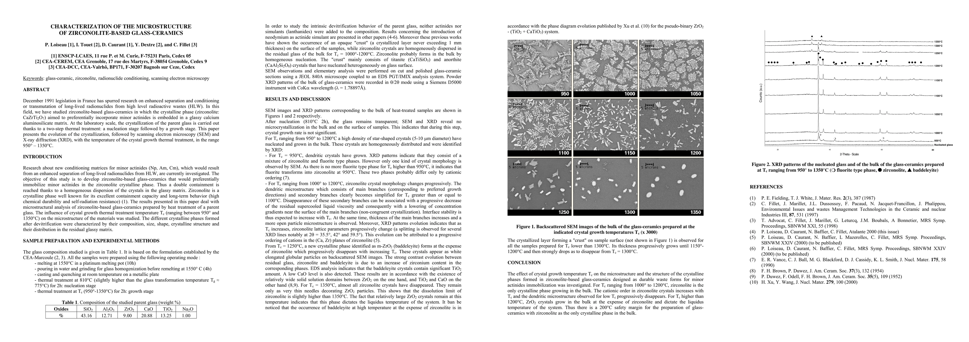 December 1991 legislation in France has spurred research on enhanced separation and conditioning or transmutation of long-lived radionuclides from high level radioactive wastes (HLW). In this field, we have studied zirconolite-based glass-ceramics in which the crystalline phase (zirconolite: CaZrTi2O7) aimed to preferentially incorporate minor actinides is embedded in a glassy calcium aluminosilicate matrix. At the laboratory scale, the crystallization of the parent glass is carried out thanks to a two-step thermal treatment: a nucleation stage followed by a growth stage. This paper presents the evolution of the crystallization, followed by scanning electron microscopy (SEM) and X-ray diffraction (XRD), with the temperature of the crystal growth thermal treatment, in the range 950 degrees - 1350 degrees C.