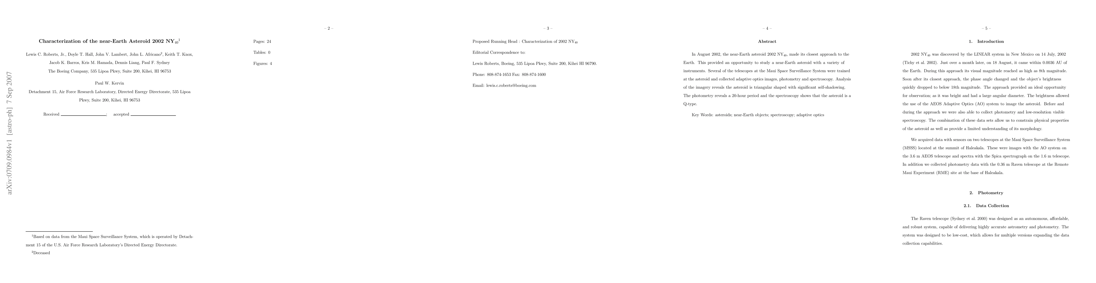 The near-Earth asteroid 2002 NY40 was studied during its August 2002 close approach to Earth using Maui Space Surveillance System telescopes, revealing a triangular shape with self-shadowing, a 20-hour rotation period, and a spectroscopic classification as a Q-type asteroid.