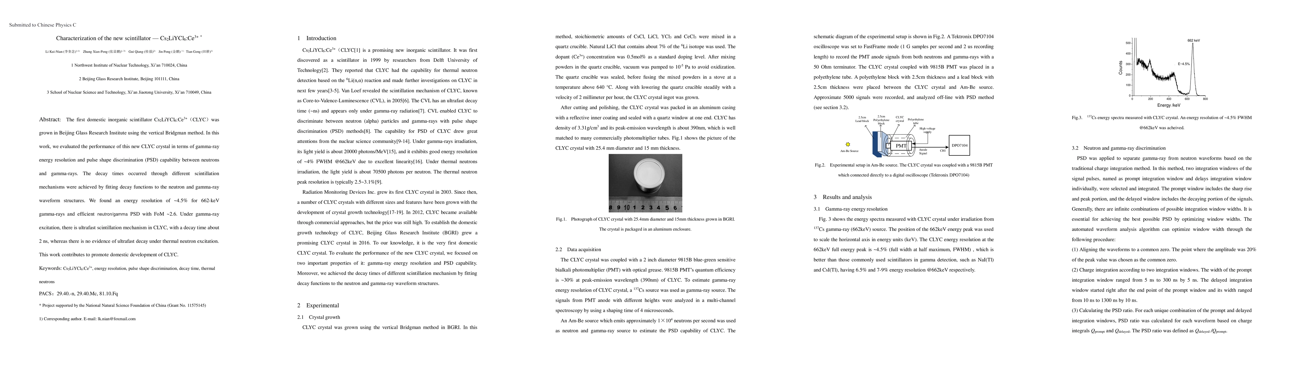 This paper characterizes the new domestic inorganic scintillator CLYC, grown using the vertical Bridgman method, and evaluates its performance in gamma-ray energy resolution and neutron/gamma-ray discrimination. The study found an energy resolution of 4.5% for 662-keV gamma-rays and efficient neutron/gamma PSD, highlighting its potential for domestic development.