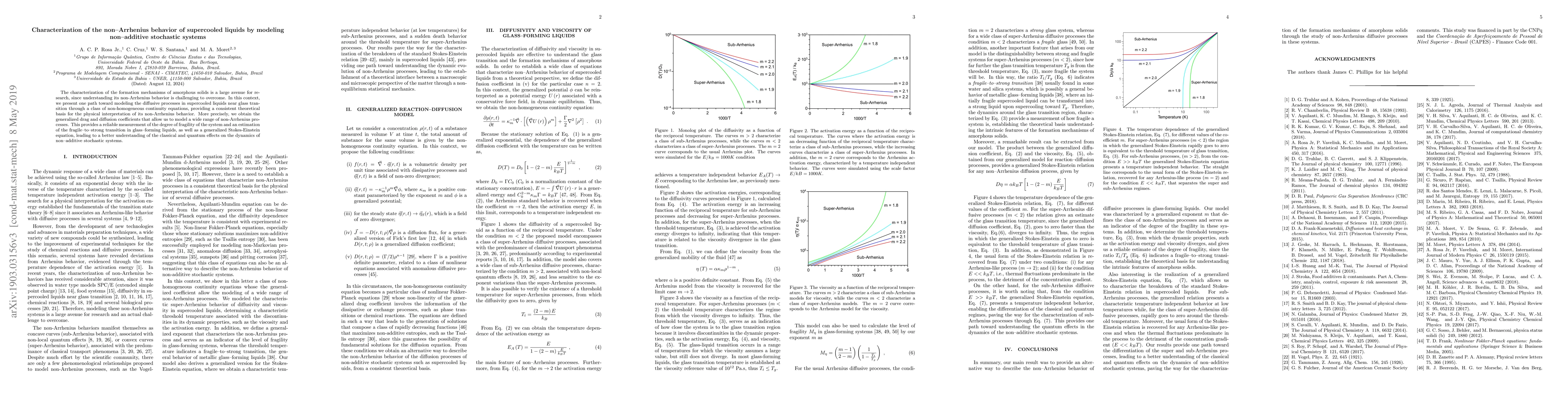 This paper models the non-Arrhenius behavior of supercooled liquids near the glass transition using non-homogeneous continuity equations, providing a theoretical basis for understanding the diffusive processes and the degree of fragility in glass-forming liquids. The study also introduces generalized drag and diffusion coefficients and a generalized Stokes-Einstein equation for better comprehension of classical and quantum effects in non-additive stochastic systems.