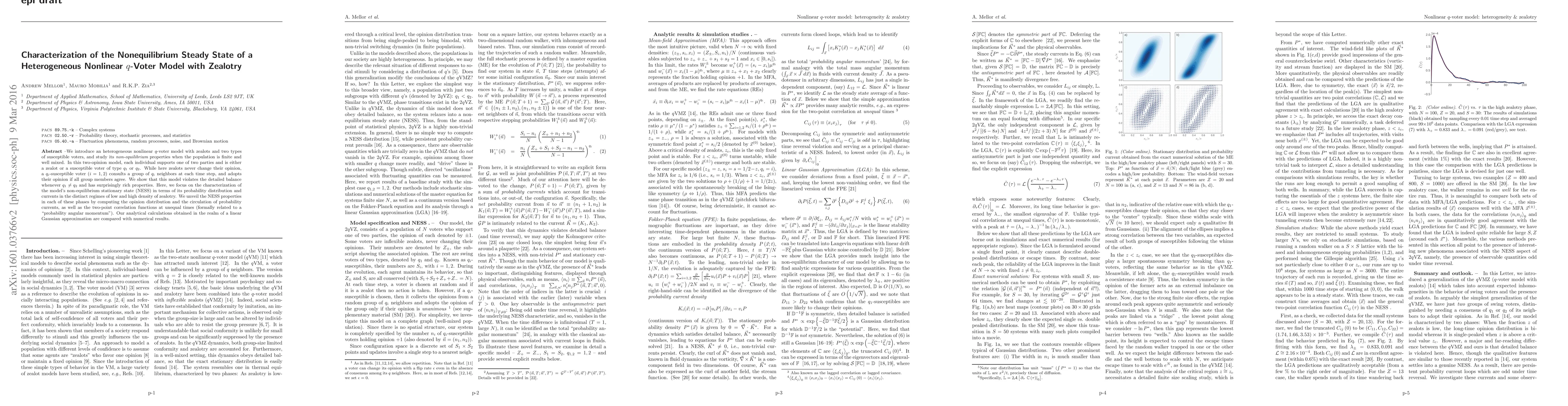 This paper characterizes the nonequilibrium steady state of a heterogeneous nonlinear $q$-voter model with zealots and two types of susceptible voters. It reveals rich properties and violates detailed balance when $q_1 \neq q_2$, focusing on the model's stationary state, opinion distribution, and probability currents, with analytical results compared to numerical simulations.