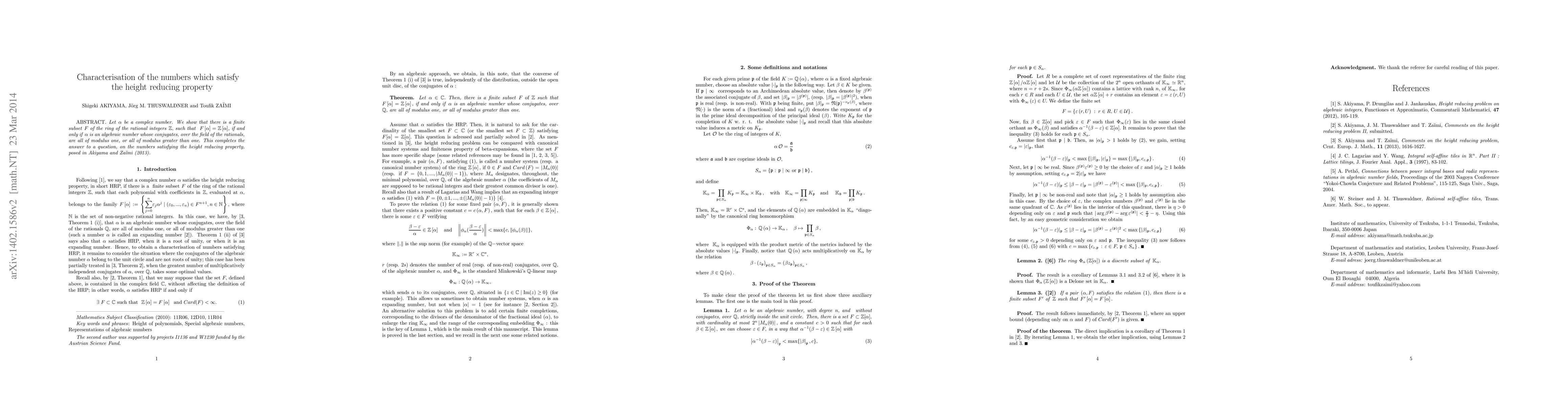 Let $\alpha$ be a complex number. We show that there is a finite subset $F$ of the ring of the rational integers $\mathbb{Z}$, such that $F\left[ \alpha\right] =\mathbb{Z}\left[ \alpha\right]$, if and only if $\alpha$ is an algebraic number whose conjugates, over the field of the rationals, are all of modulus one, or all of modulus greater than one. This completes the answer to a question, on the numbers satisfying the height reducing property, posed in [3].