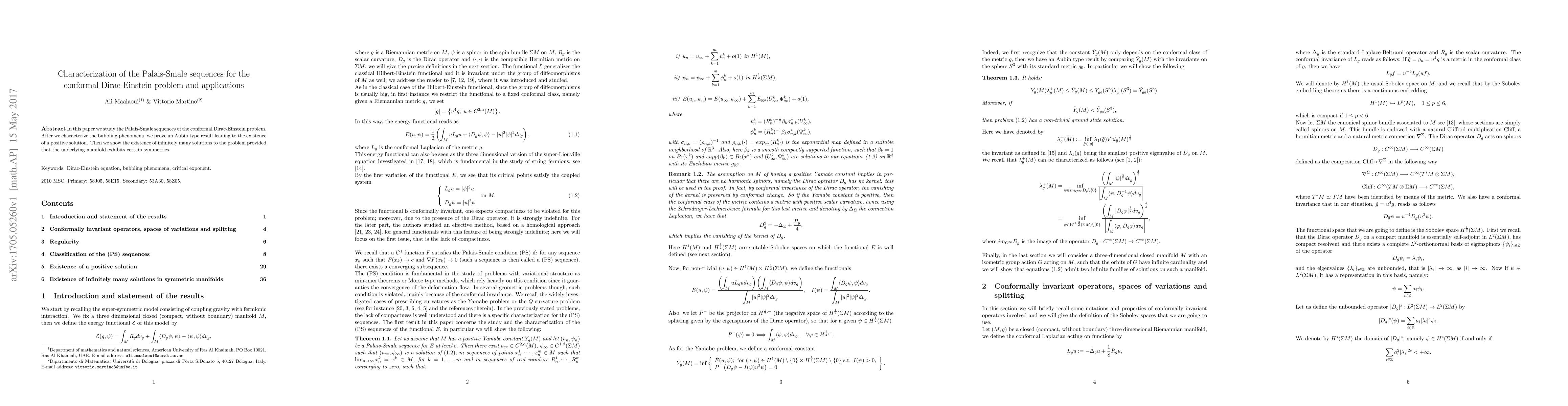 This paper characterizes Palais-Smale sequences for the conformal Dirac-Einstein problem, identifying bubbling phenomena and proving an Aubin type result to establish the existence of a positive solution. It also demonstrates the existence of infinitely many solutions under specific manifold symmetries.