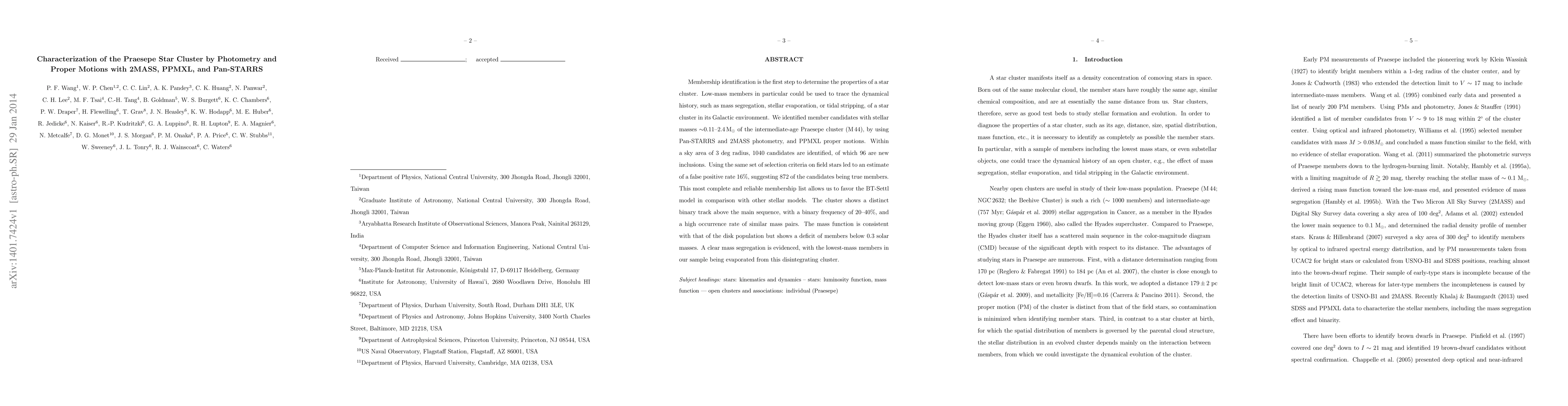 Membership identification is the first step to determine the properties of a star cluster. Low-mass members in particular could be used to trace the dynamical history, such as mass segregation, stellar evaporation, or tidal stripping, of a star cluster in its Galactic environment. We identified member candidates with stellar masses $\sim$0.11--2.4 Msun of the intermediate-age Praesepe cluster (M44), by using Pan-STARRS and 2MASS photometry, and PPMXL proper motions. Within a sky area of 3 deg radius, 1040 candidates are identified, of which 96 are new inclusions. Using the same set of selection criteria on field stars led to an estimate of a false positive rate 16%, suggesting 872 of the candidates being true members. This most complete and reliable membership list allows us to favor the BT-Settl model in comparison with other stellar models. The cluster shows a distinct binary track above the main sequence, with a binary frequency of 20--40%, and a high occurrence rate of similar mass pairs. The mass function is consistent with that of the disk population but shows a deficit of members below 0.3 solar masses. A clear mass segregation is evidenced, with the lowest-mass members in our sample being evaporated from this disintegrating cluster.