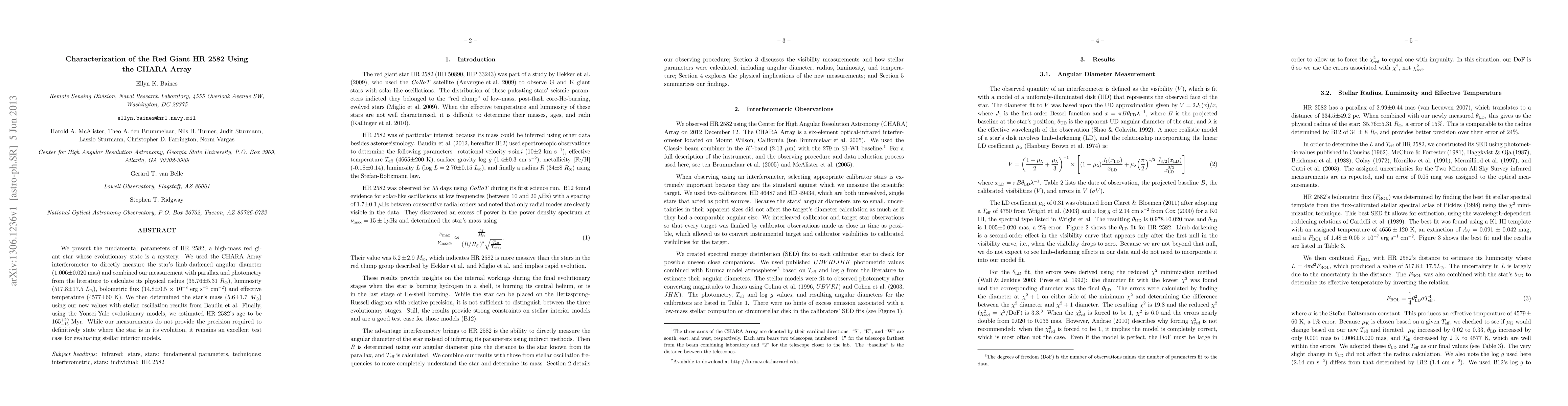 We present the fundamental parameters of HR 2582, a high-mass red giant star whose evolutionary state is a mystery. We used the CHARA Array interferometer to directly measure the star's limb-darkened angular diameter (1.006+/-0.020 mas) and combined our measurement with parallax and photometry from the literature to calculate its physical radius (35.76+/-5.31 R_Sun), luminosity (517.8+/-17.5 L_Sun), bolometric flux (14.8+/-0.5 e-8 erg s-1 cm-2) and effective temperature (4577+/-60 K). We then determined the star's mass (5.6+/-1.7 M_Sun) using our new values with stellar oscillation results from Baudin et al. Finally, using the Yonsei-Yale evolutionary models, we estimated HR 2582's age to be 165 +20/-15 Myr. While our measurements do not provide the precision required to definitively state where the star is in its evolution, it remains an excellent test case for evaluating stellar interior models.