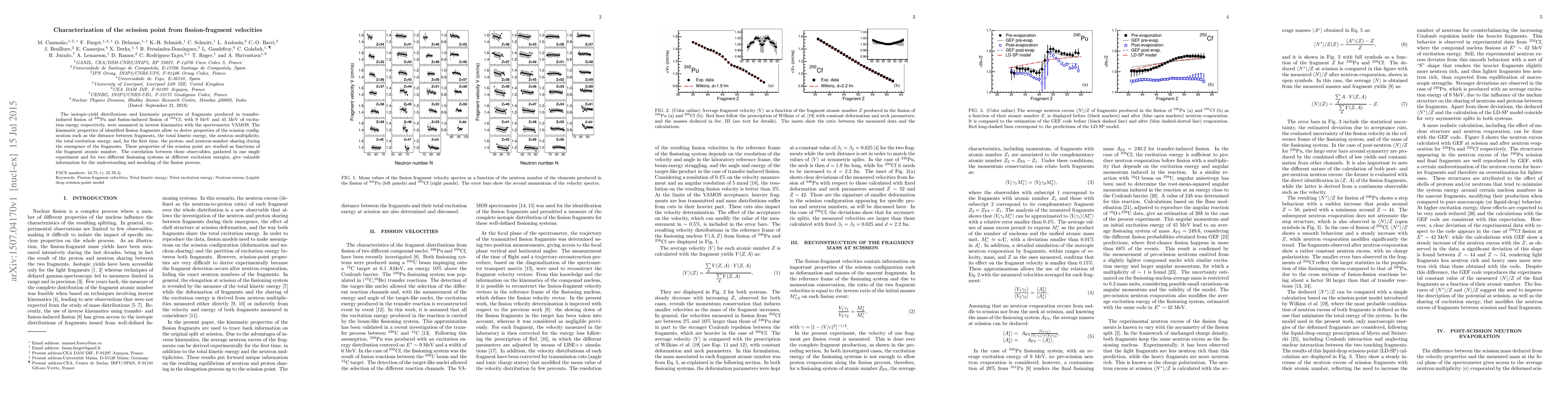 The isotopic-yield distributions and kinematic properties of fragments produced in transfer-induced fission of 240Pu and fusion-induced fission of 250Cf, with 9 MeV and 45 MeV of excitation energy respectively, were measured in inverse kinematics with the spectrometer VAMOS. The kinematic properties of identified fission fragments allow to derive properties of the scission configuration such as the distance between fragments, the total kinetic energy, the neutron multiplicity, the total excitation energy, and, for the first time, the proton- and neutron-number sharing during the emergence of the fragments. These properties of the scission point are studied as functions of the fragment atomic number. The correlation between these observables, gathered in one single experiment and for two different fissioning systems at different excitation energies, give valuable information for the understanding and modeling of the fission process.