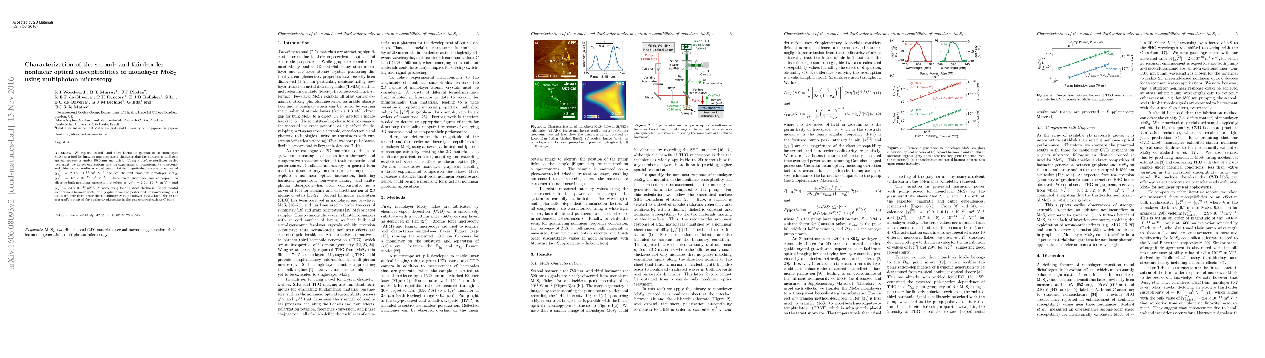 Researchers characterized monolayer MoS2's nonlinear optical properties using multiphoton microscopy, finding stronger third-order sheet nonlinearity compared to graphene, with values for second- and third-order nonlinear susceptibilities of $2.0 imes 10^{-20}$ m$^2$ V$^{-1}$ and $1.7 imes 10^{-28}$ m$^3$ V$^{-2}$, respectively.