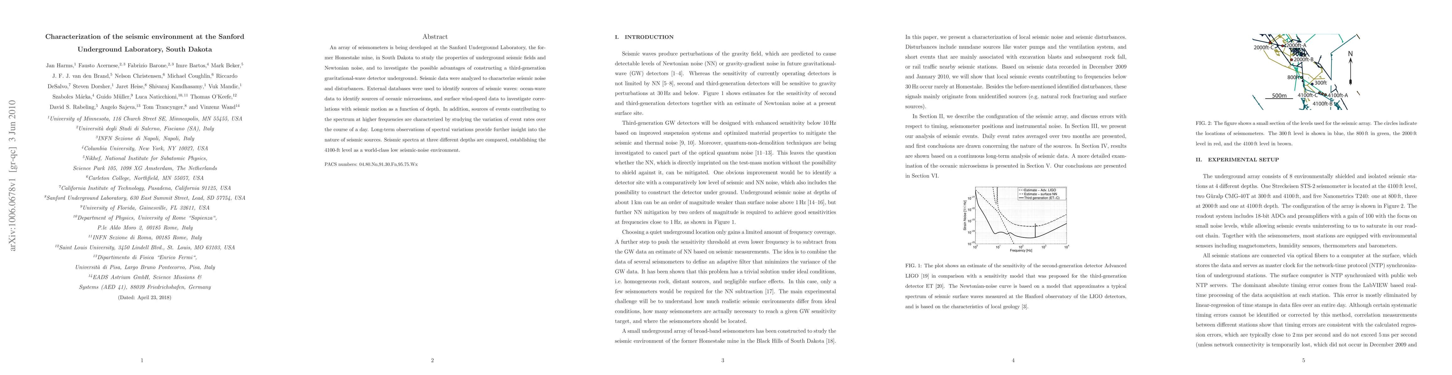An array of seismometers is being developed at the Sanford Underground Laboratory, the former Homestake mine, in South Dakota to study the properties of underground seismic fields and Newtonian noise, and to investigate the possible advantages of constructing a third-generation gravitational-wave detector underground. Seismic data were analyzed to characterize seismic noise and disturbances. External databases were used to identify sources of seismic waves: ocean-wave data to identify sources of oceanic microseisms, and surface wind-speed data to investigate correlations with seismic motion as a function of depth. In addition, sources of events contributing to the spectrum at higher frequencies are characterized by studying the variation of event rates over the course of a day. Long-term observations of spectral variations provide further insight into the nature of seismic sources. Seismic spectra at three different depths are compared, establishing the 4100-ft level as a world-class low seismic-noise environment.