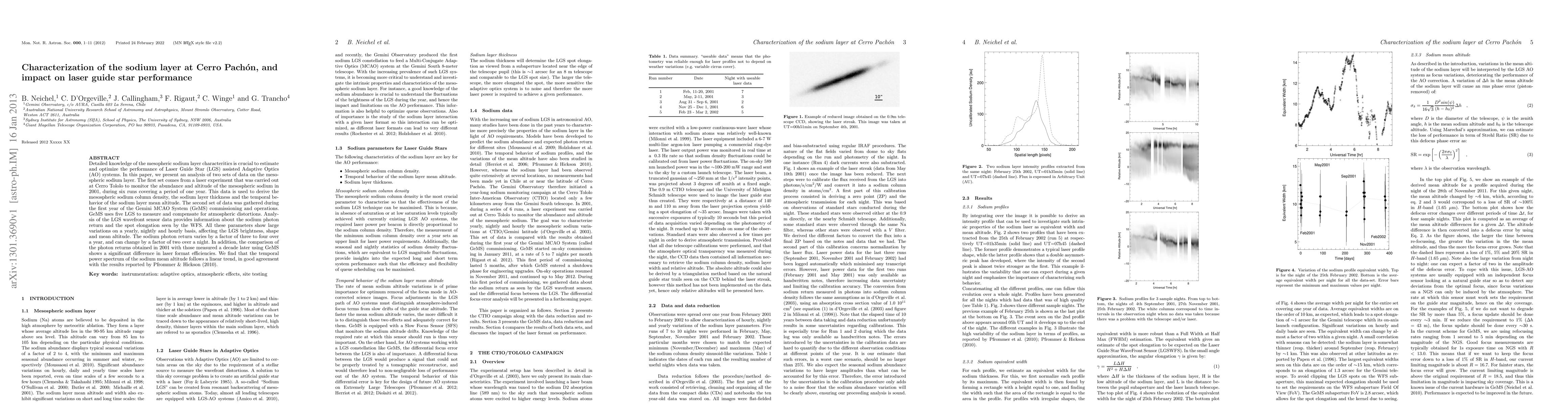 Detailed knowledge of the mesopheric sodium layer characteristics is crucial to estimate and optimize the performance of Laser Guide Star (LGS) assisted Adaptive Optics (AO) systems. In this paper, we present an analysis of two sets of data on the mesospheric sodium layer. The first set comes from a laser experiment that was carried out at Cerro Tololo to monitor the abundance and altitude of the mesospheric sodium in 2001, during six runs covering a period of one year. This data is used to derive the mesospheric sodium column density, the sodium layer thickness and the temporal behavior of the sodium layer mean altitude. The second set of data was gathered during the first year of the Gemini MCAO System (GeMS) commissioning and operations. GeMS uses five LGS to measure and compensate for atmospheric distortions. Analysis of the LGS wavefront sensor data provides information about the sodium photon return and the spot elongation seen by the WFS. All these parameters show large variations on a yearly, nightly and hourly basis, affecting the LGS brightness, shape and mean altitude. The sodium photon return varies by a factor of three to four over a year, and can change by a factor of two over a night. In addition, the comparison of the photon returns obtained in 2001 with those measured a decade later using GeMS shows a significant difference in laser format efficiencies. We find that the temporal power spectrum of the sodium mean altitude follows a linear trend, in good agreement with the results reported by Pfrommer & Hickson (2010).
