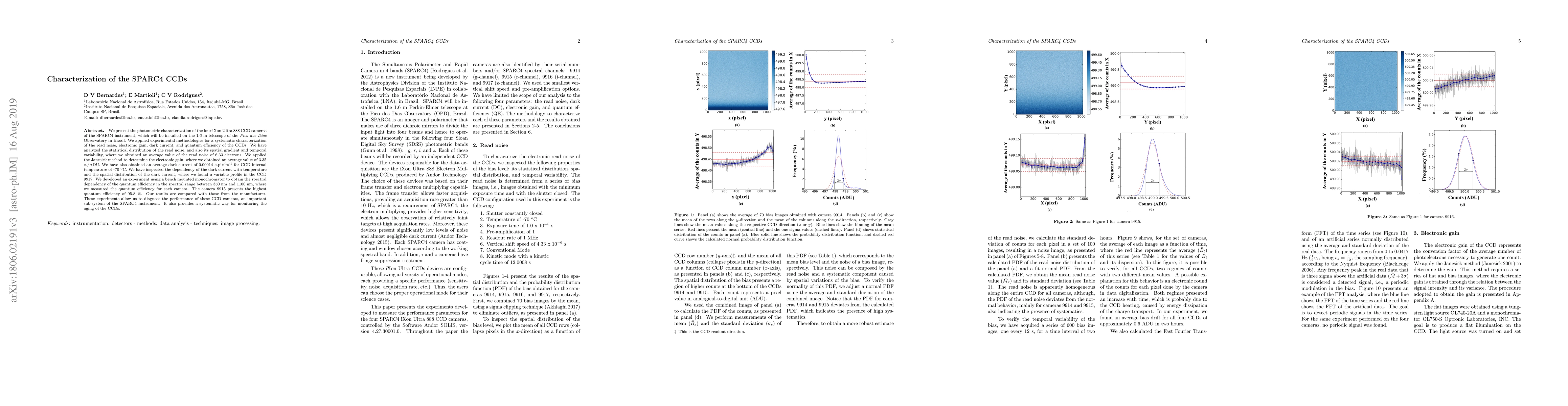 Researchers characterize the performance of four iXon Ultra 888 CCD cameras used in the SPARC4 instrument, including read noise, electronic gain, dark current, and quantum efficiency, with key findings including average values for these parameters and variations among the cameras.