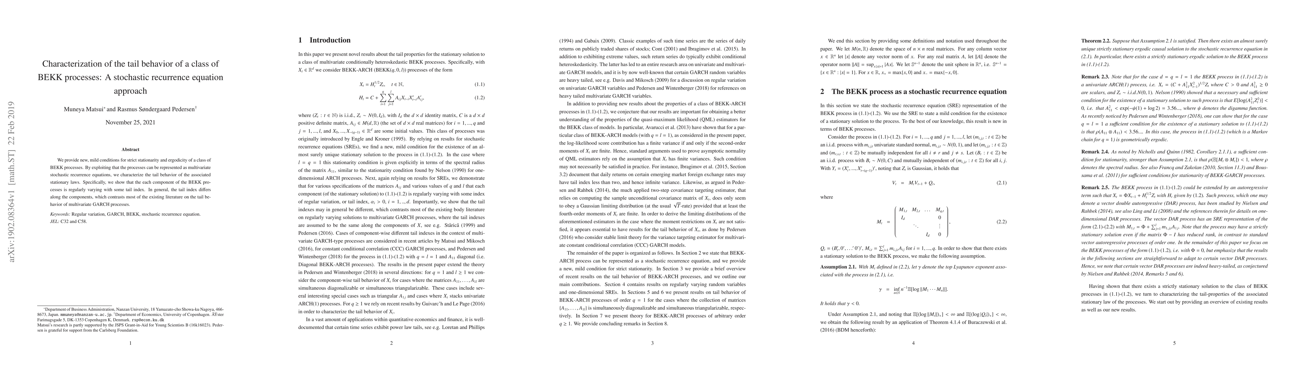 This paper establishes mild conditions for the strict stationarity and ergodicity of a class of BEKK processes, represented as multivariate stochastic recurrence equations. It characterizes the tail behavior of these processes, showing that each component exhibits regular variation with distinct tail indices, differing across components.