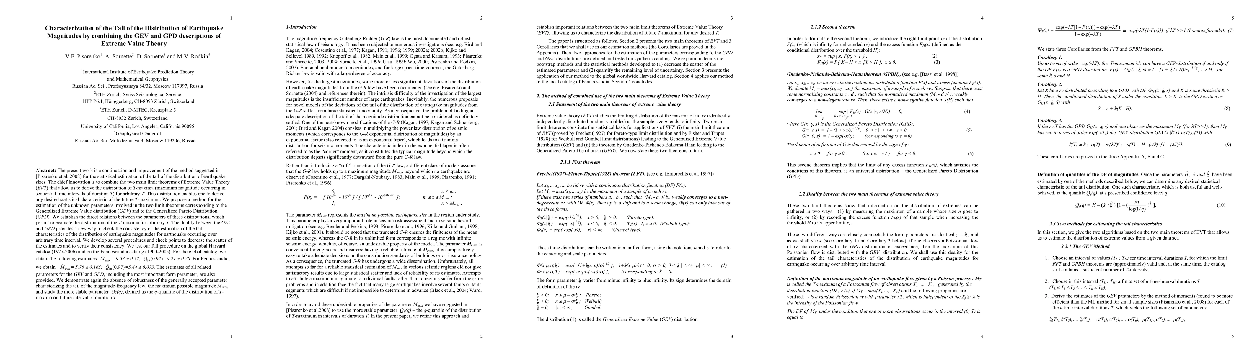 We present a generic and powerful approach to study the statistics of extreme phenomena (meteorology, finance, biology...) that we apply to the statistical estimation of the tail of the distribution of earthquake sizes. The chief innovation is to combine the two main limit theorems of Extreme Value Theory (EVT) that allow us to derive the distribution of T-maxima (maximum magnitude occurring in sequential time intervals of duration T) for arbitrary T. We propose a method for the estimation of the unknown parameters involved in the two limit theorems corresponding to the Generalized Extreme Value distribution (GEV) and to the Generalized Pareto Distribution (GPD). We establish the direct relations between the parameters of these distributions, which permit to evaluate the distribution of the T-maxima for arbitrary T. The duality between the GEV and GPD provides a new way to check the consistency of the estimation of the tail characteristics of the distribution of earthquake magnitudes for earthquake occurring over arbitrary time interval. We develop several procedures and check points to decrease the scatter of the estimates and to verify their consistency. We test our full procedure on the global Harvard catalog (1977-2006) and on the Fennoscandia catalog (1900-2005). For the global catalog, we obtain the following estimates: Mmax = 9.53 +- 0.52; quantile(0.97)==9.21 +- 0.20. For Fennoscandia, we obtain Mmax = 5.76 +- 0.165; quantile(0.97) =5.44 +- 0.073. The estimates of all related parameters for the GEV and GPD, including the most important form parameter, are also provided.
