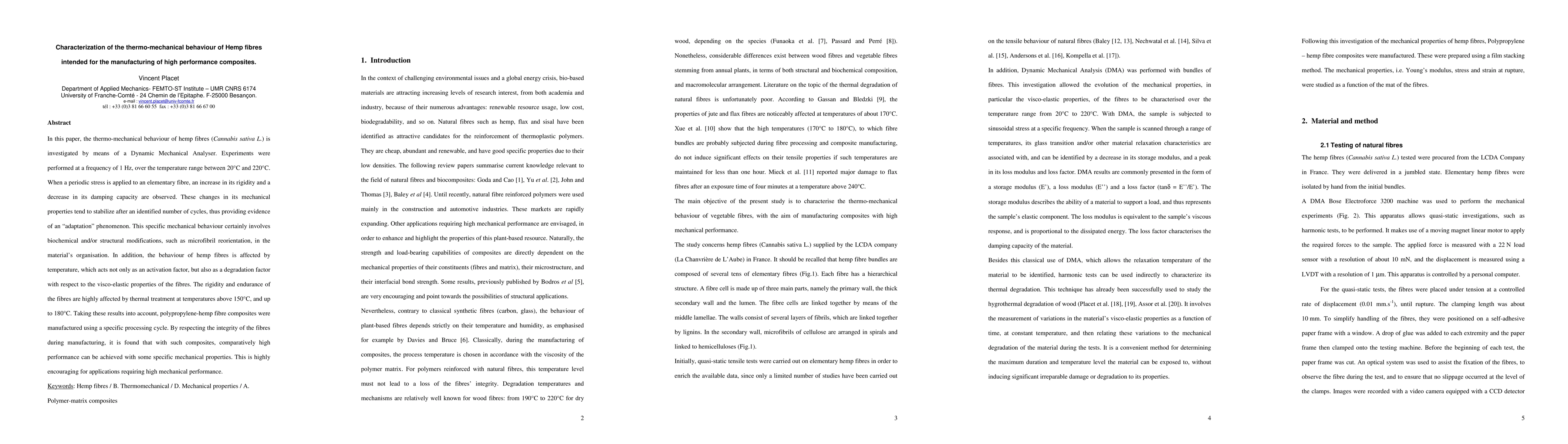 This paper investigates the thermo-mechanical behaviour of hemp fibres using a Dynamic Mechanical Analyser, revealing an increase in fibre rigidity and reduced damping capacity upon periodic solicitation, indicating an "adaptation" phenomenon. The study highlights the significant impact of temperature on fibre properties, especially at temperatures above 150°C to 180°C, and demonstrates promising mechanical properties in polypropylene-hemp composites when fibres' integrity is preserved during manufacturing.