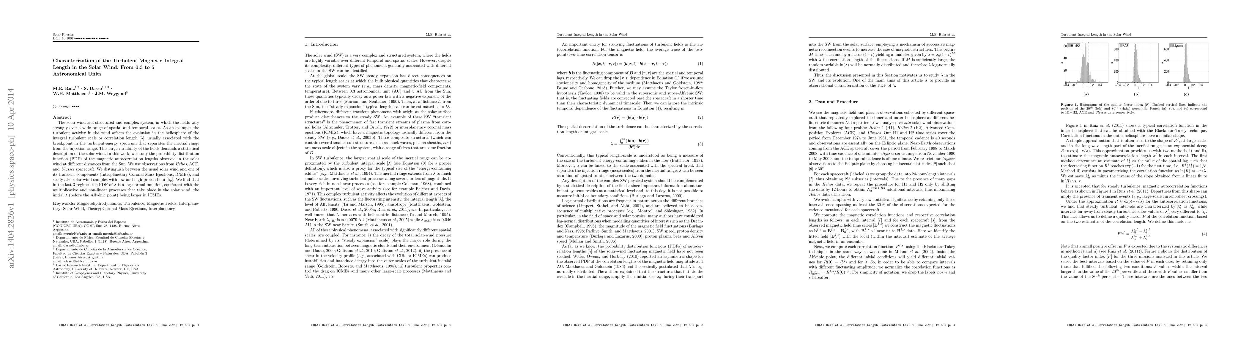 The solar wind is a structured and complex system, in which the fields vary strongly over a wide range of spatial and temporal scales. As an example, the turbulent activity in the wind affects the evolution in the heliosphere of the integral turbulent scale or correlation length [{\lambda}], usually associated with the breakpoint in the turbulent-energy spectrum that separates the inertial range from the injection range. This large variability of the fields demands a statistical description of the solar wind. In this work, we study the probability distribution function (PDF) of the magnetic autocorrelation lengths observed in the solar wind at different distances from the Sun. We use observations from Helios, ACE, and Ulysses spacecraft. We distinguish between the usual solar wind and one of its transient components (Interplanetary Coronal Mass Ejections, ICMEs), and study also solar wind samples with low and high proton beta [\beta_p ]. We find that in the last 3 regimes the PDF of {\lambda} is a log-normal function, consistent with the multiplicative and non-linear processes that take place in the solar wind, the initial {\lambda} (before the Alfv\'enic point) being larger in ICMEs.