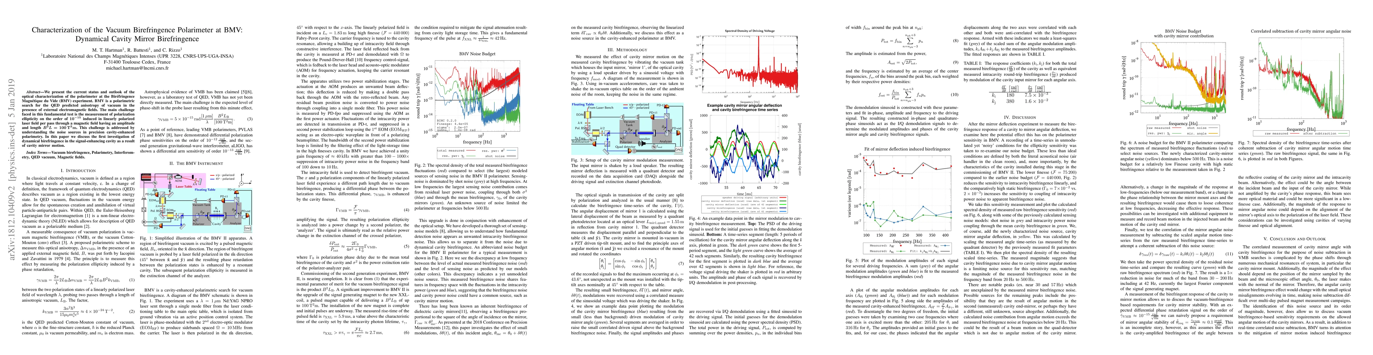 We present the current status and outlook of the optical characterization of the polarimeter at the Bir\'{e}fringence Magn\'etique du Vide (BMV) experiment. BMV is a polarimetric search for the QED predicted anisotropy of vacuum in the presence of external electromagnetic fields. The main challenge faced in this fundamental test is the measurement of polarization ellipticity on the order of ${10^{-15}}$ induced in linearly polarized laser field per pass through a magnetic field having an amplitude and length ${B^{2}L=100\,\mathrm{T}^{2}\mathrm{m}}$. This challenge is addressed by understanding the noise sources in precision cavity-enhanced polarimetry. In this paper we discuss the first investigation of dynamical birefringence in the signal-enhancing cavity as a result of cavity mirror motion.