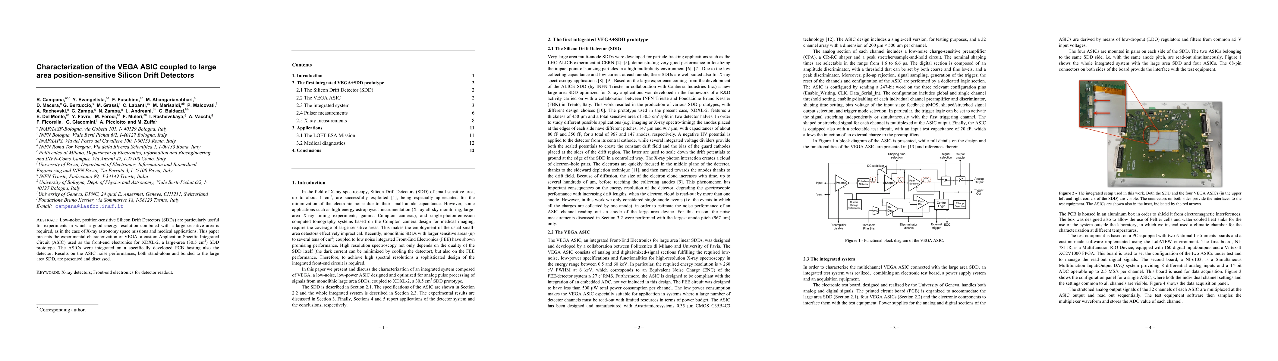 This paper characterizes VEGA ASIC, the front-end electronics for a large-area Silicon Drift Detector (SDD) used in X-ray astronomy and medical applications, focusing on its noise performance both independently and when coupled to the SDD. Results highlight the ASIC's suitability for experiments requiring high energy resolution and large sensitive areas.